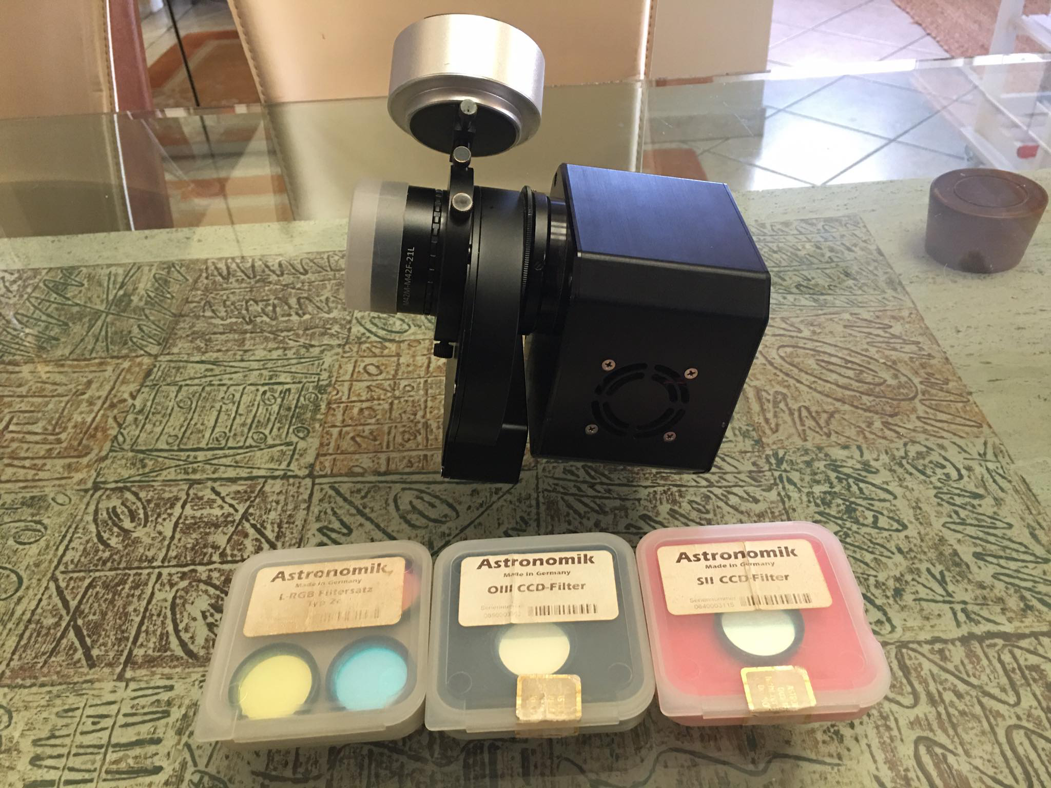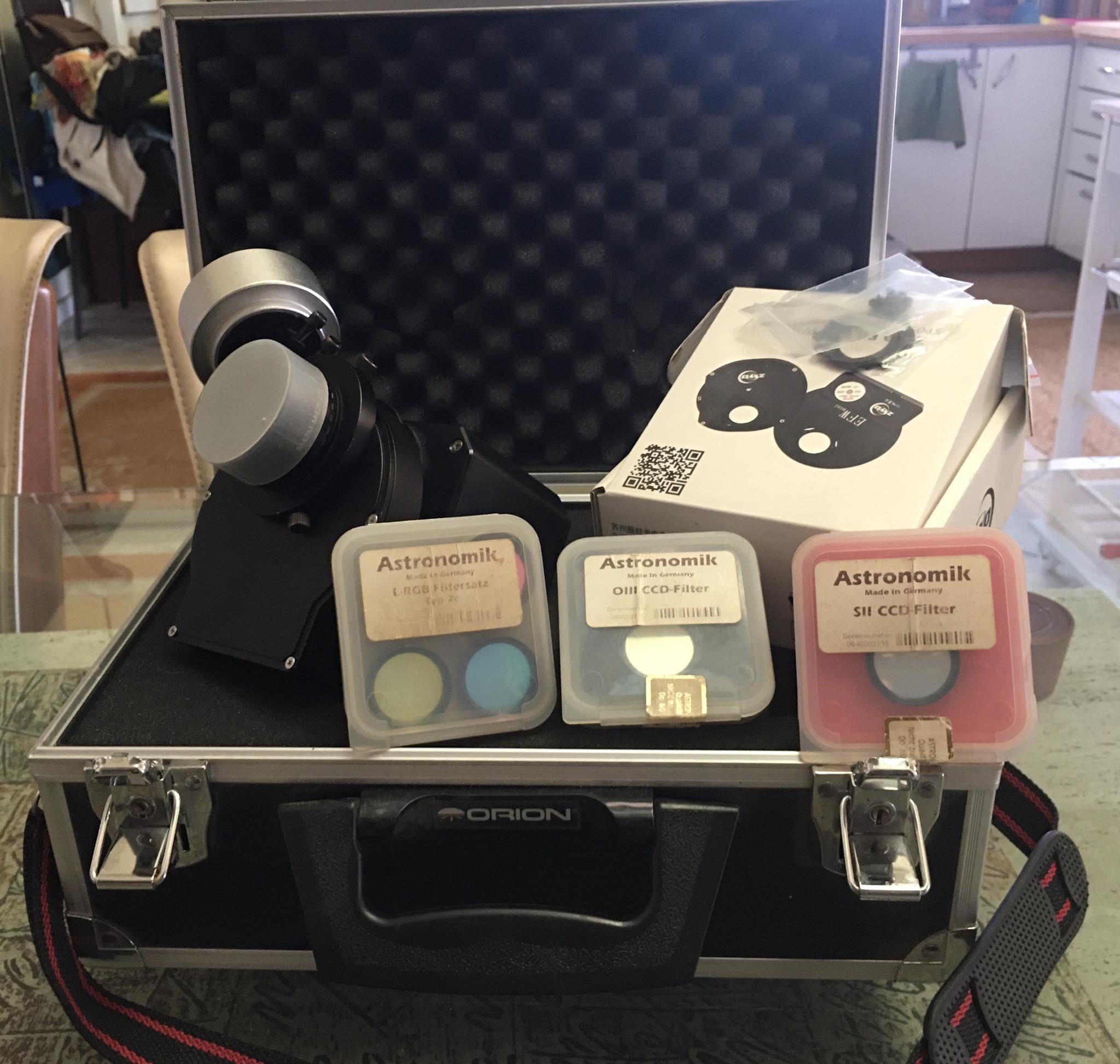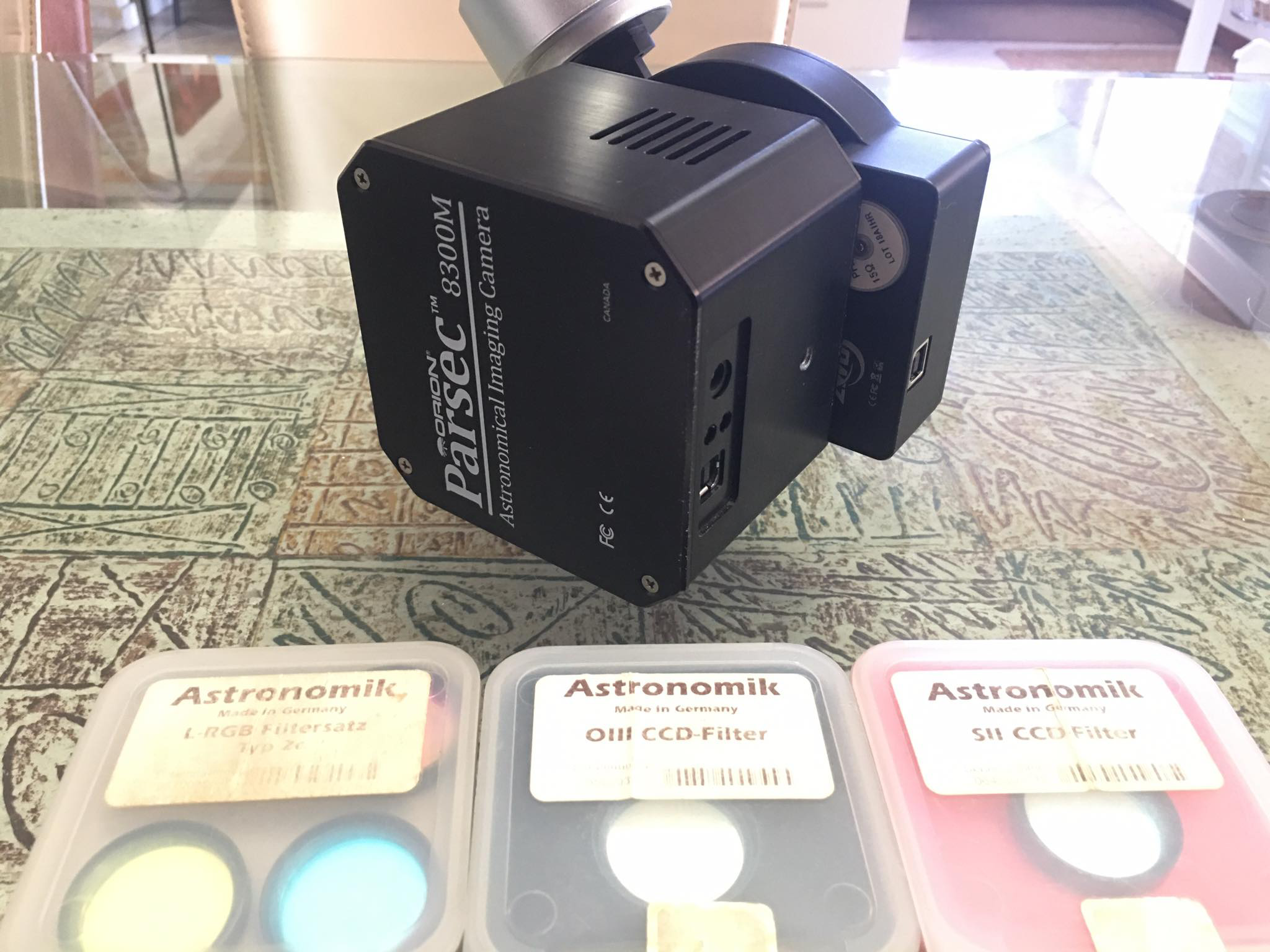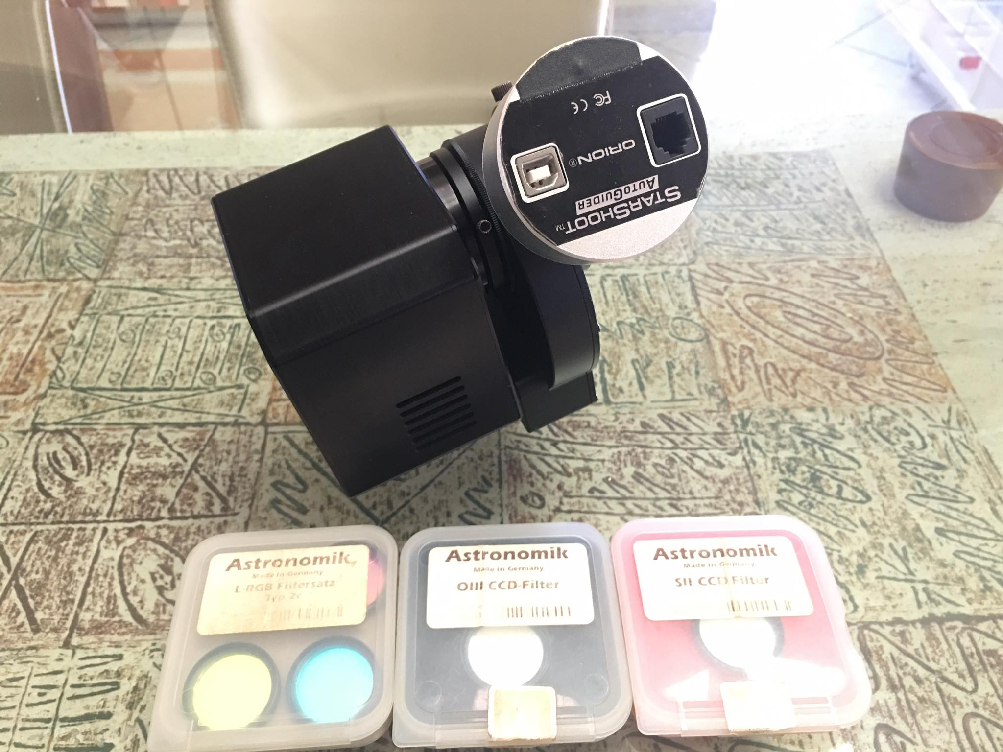 Το stup αποτελείται από: Orion Parsec 8300 ccd κάμερα (με το θρυλικό τσιπάκι 8300 Kodak και τη γνωστή ευαισθησία στο Ηα), την Orion SSAG κάμερα για οδήγηση και πλανητική φωτογράφηση, τo off-axis guider της Ts, τον τροχό φίλτρων mini της ASI για 5 φίλτρα 1,25, rotator της Ts, σετ φίλτρων L-RGB type2 της Astronomik, και φίλτρα στενής μπάντας (narrowband) Ha, OIII,SII, 12nm της Astronomik. Όλα στην τιμή των 1200.