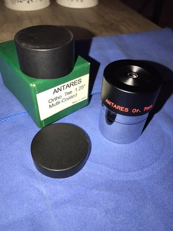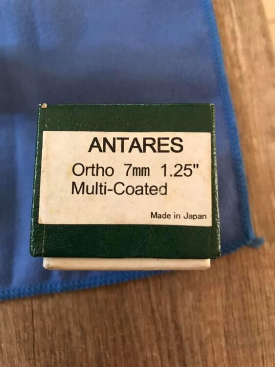 Πωλείται ορθοσκοπικό προσοφθάλμιο Antares Abbe Orthoscopic 7mm, διαμέτρου 1.25 ιντσών, Made in Japan, σε πάρα πολύ καλή κατάσταση, με το κουτί του και τα δύο καπάκια του. Ιδανικό για πλανητική παρατήρηση υψηλών προδιαγραφών. Δεν παράγεται πια και είναι αρκετά δυσεύρετο στην αγορά μεταχειρισμένων, καινούργιο δεν υπάρχει πουθενά. Είναι εφάμιλλο των University Optics HD ορθοσκοπικών φακών.