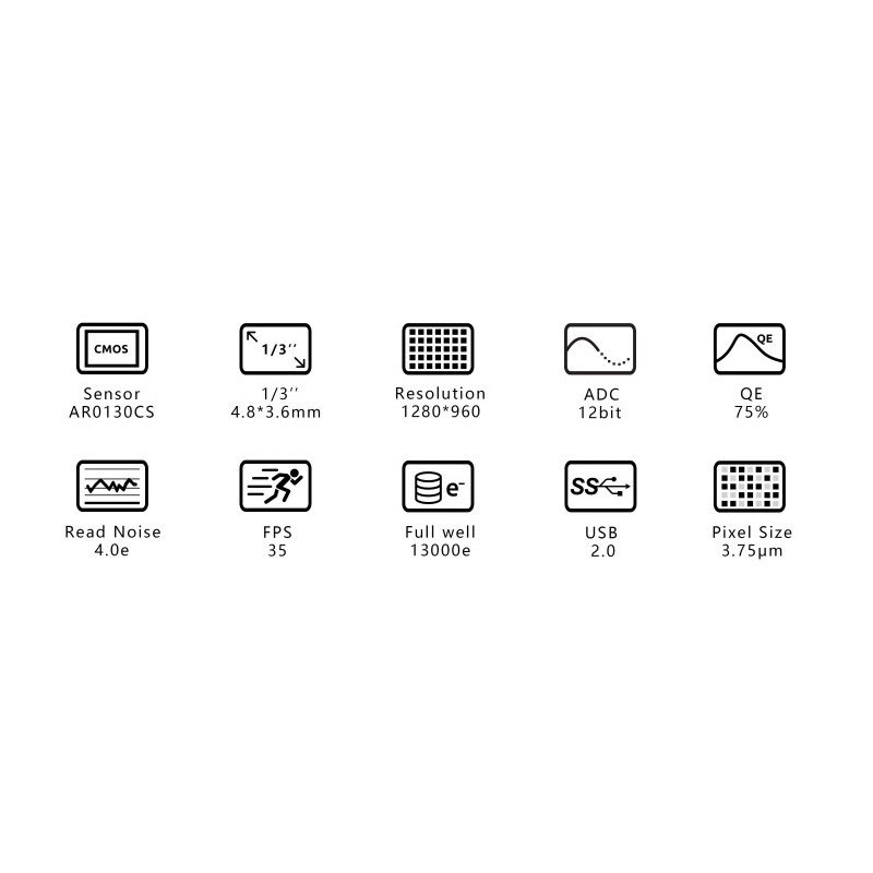 Η κάμερα ASI120MM Mini Mono της εταιρείας ZWO διαθέτει ενσωματωμένο αισθητήρα AR0130CS 1/3’’ (4.8 mm x 3.6 mm), και αποτελείται από 1280x960 pixels. Το μέγεθος των pixel είναι 3.75 x 3.75 μm. Η κάμερα αυτή παρέχει 12 bit για τη μετατροπή αναλογικού σήματος σε ψηφιακό (ADC) και η κβαντική της απόδοση φτάνει το 80%.