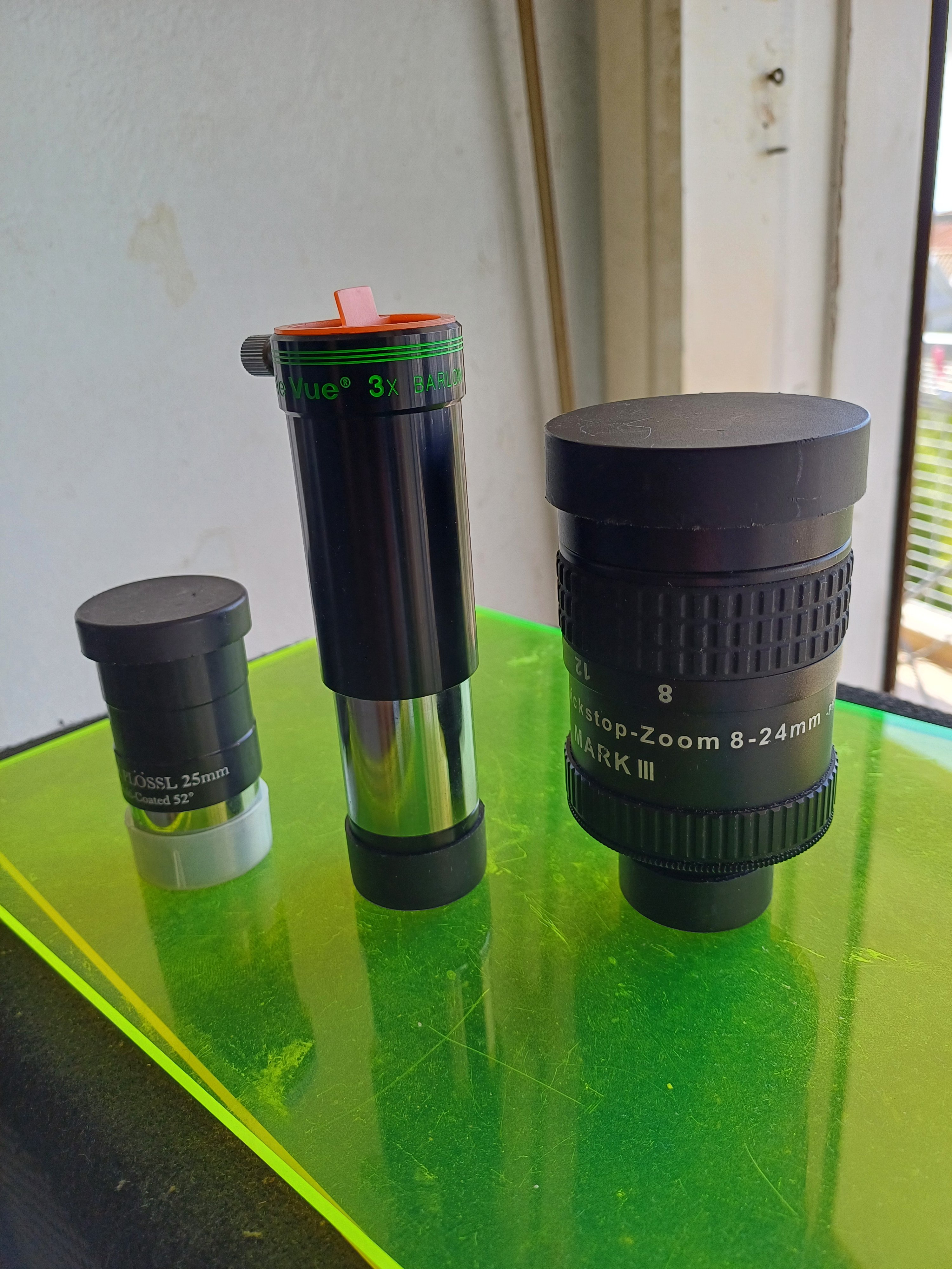 Δίνεται μαζί με τρία προσολφθαμια, το δικό του το 25αρι, Ένα Ζουμ της Baader 24 - 8 και ένα Barlow της televue x3, όλα σε άριστη κατάσταση στα 850€.