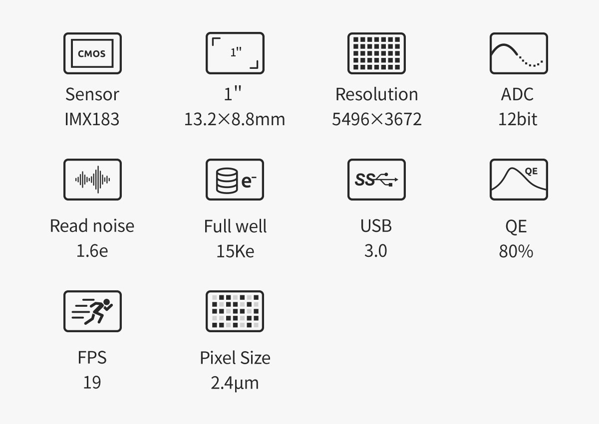 Η συγκεκριμένη κάμερα έχει δεχθεί ελάχιστη χρήση, είναι πρακτικά καινούργια. Περιλαμβάνεται στην αρχική της συσκευασία μαζί με όλα τα καλώδια και τα παρελκόμενά της. Η συγκεκριμένη έκδοση είναι χωρίς ψύξη, ωστόσο ο IMX183 που φέρει αποδίδει καλά σε εκθέσεις που διαρκούν μέχρι μερικά λεπτά. Επίσης μπορεί να χρησιμοποιηθεί για φωτογράφιση σελήνης, πλανητών, βιντεο, livestacking και autoguiding.