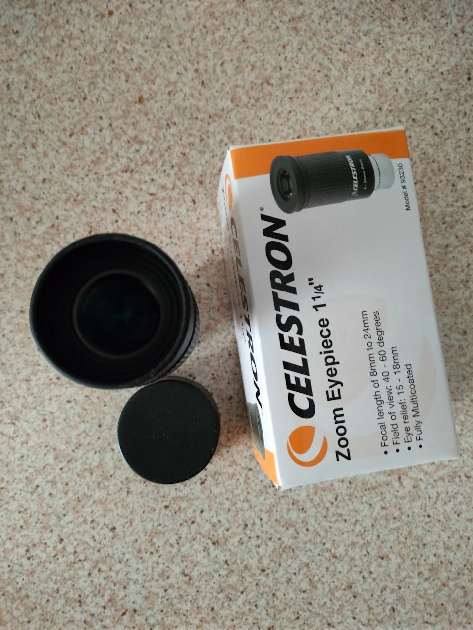 Celestron zoom eyepiece 8-24mm 60-40 μοίρες AFOV, με τα καπάκια του και το κουτί του.
