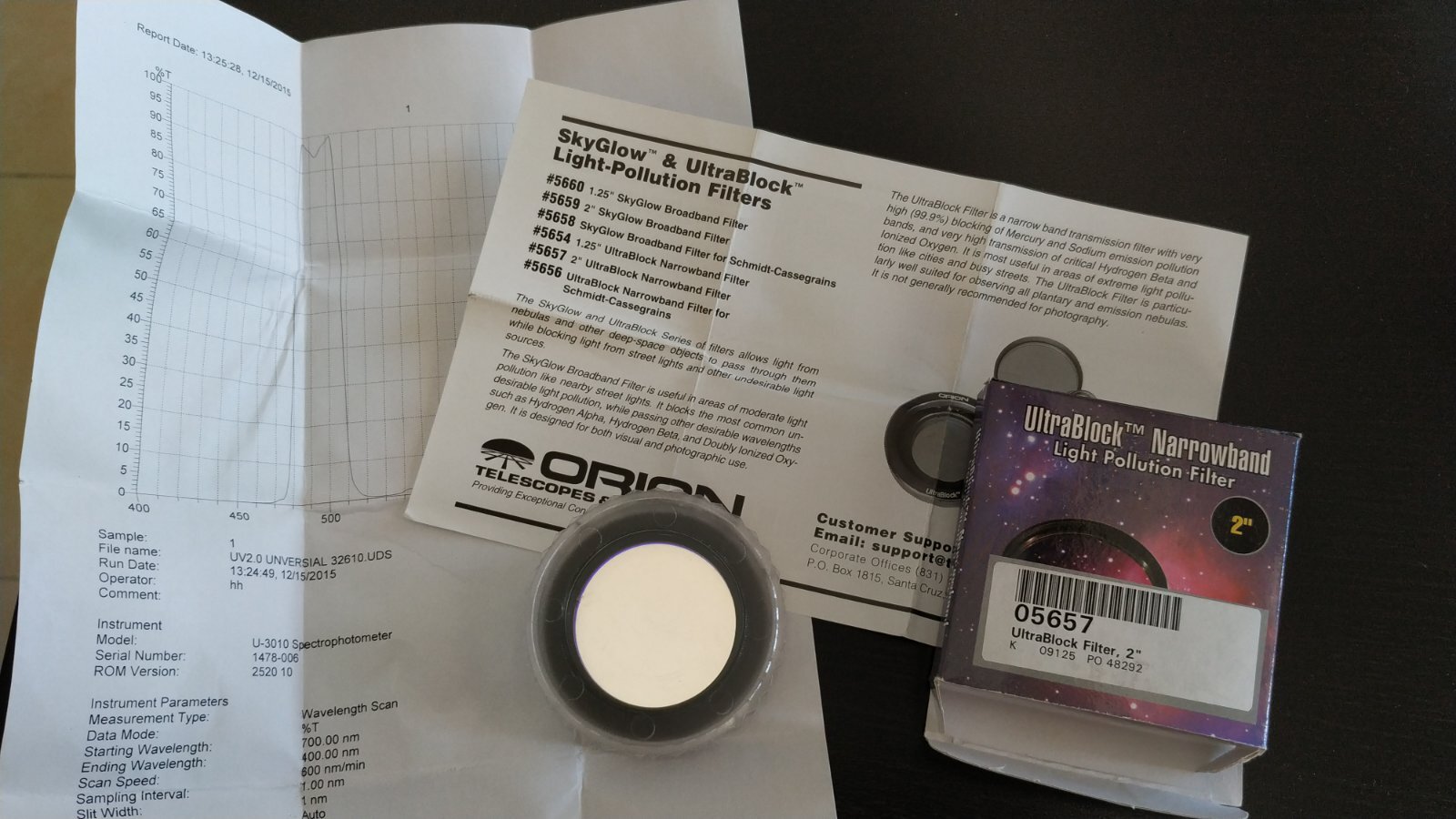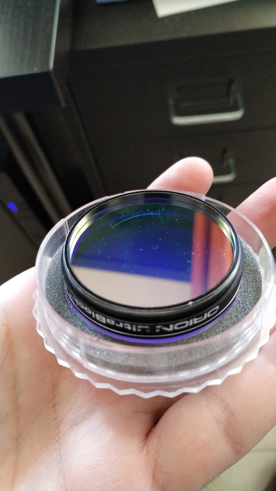 Πωλείται φίλτρο φωτορύπανσης Orion Ultrablock Narrowband 2". Προορίζεται μόνο για παρατήρηση. Ενισχύει σημαντικά το contrast στα αντικείμενα βαθέως ουρανού αλλά προσδίδει μπλε χρωματισμό όπως φαίνεται σε αυτή τη φωτογραφία (δεν είναι δική μου). Υπάρχει η θήκη, το κουτί και τα έγγραφά του. Έχει πολύ ήπιες γραμμές στην επίστρωση του κρύσταλλου από το καθάρισμα, δεν δημιουργούν όμως κανένα πρόβλημα στην παρατήρηση. Τιμή 50€.
