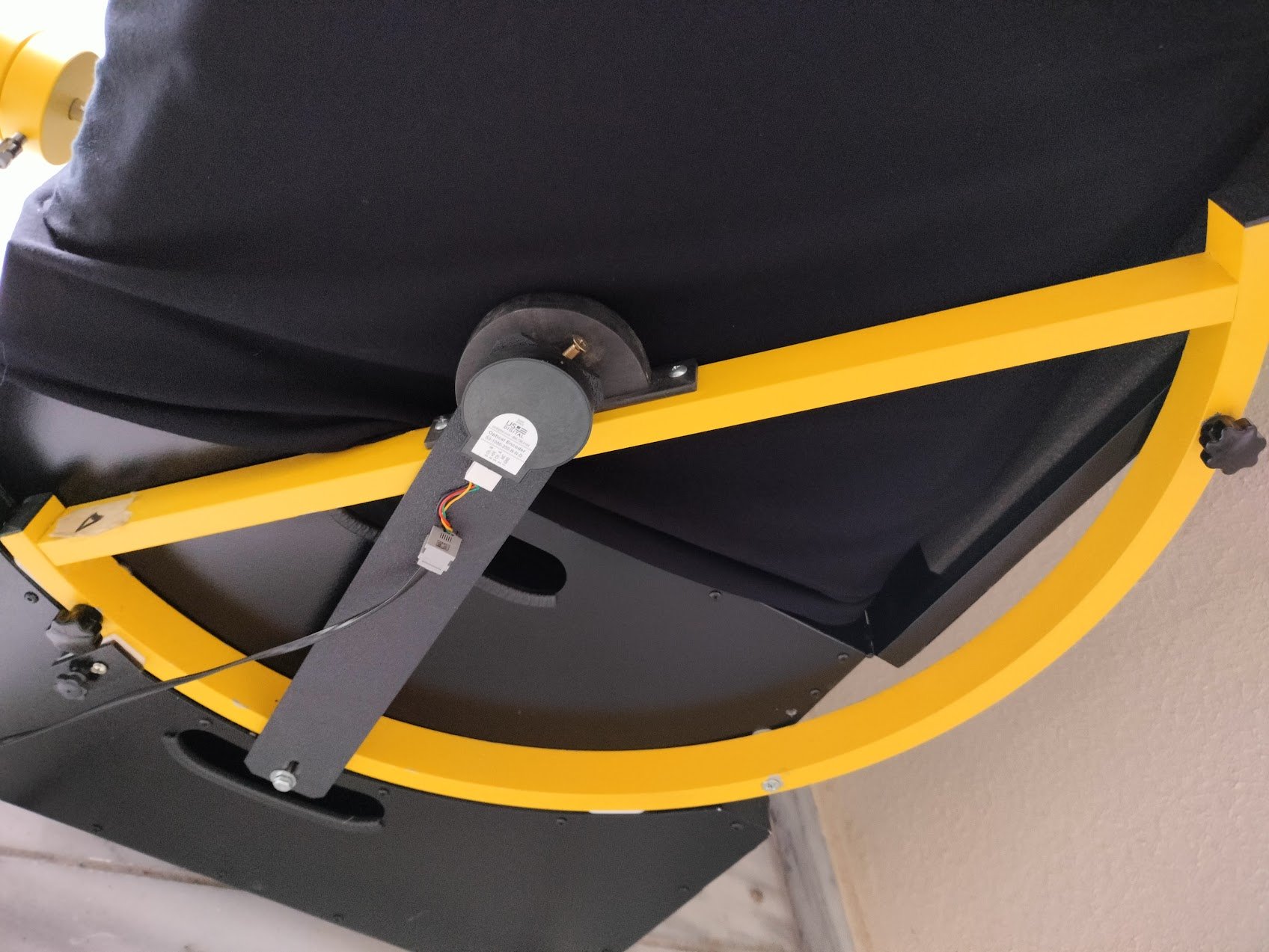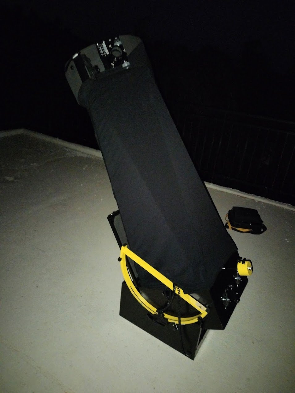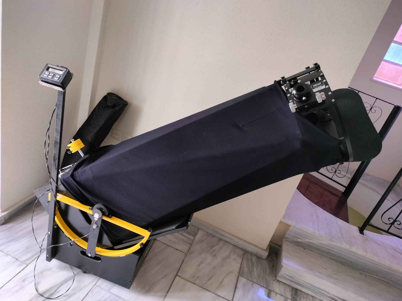 Explore Scientific 16" dobsonian όπως φαίνεται στις φωτογραφίες. Περιλαμβάνεται light shroud (ραμένο στα μέτρα του τηλεσκοπίου από ελαστικό φωτοστεγές ύφασμα), after market θήκη μεταφοράς για τα truss poles, σύστημα αντίβαρων της ES (φαίνεται σε μία από τις φωτογραφίες) και red dot finder. Επιπλέον έχουν εγκατασταθεί βιδωτά stop αριστερά και δεξιά του κιβωτίου με teflon pads τα οποία αποτρέπουν μικρο-μετακινήσεις του σώματος του τηλεσκοπίου αριστερά-δεξιά κατά την κίνηση καθ' ύψος. Δεν περιλαμβάνονται το κιτ με τους encoders, Υ καλώδιο και το χειριστήριο της skyeng που φαίνονται στις φωτό.