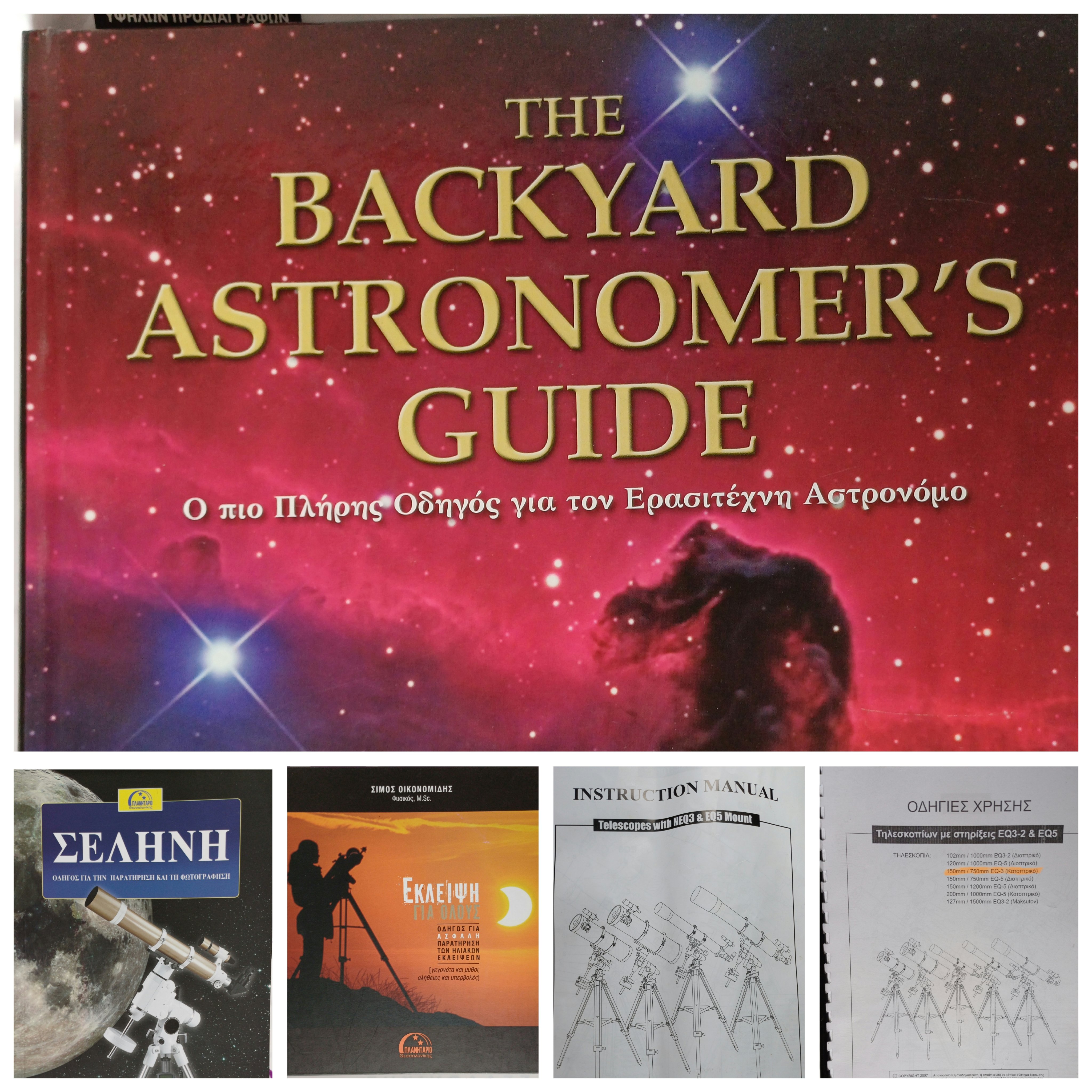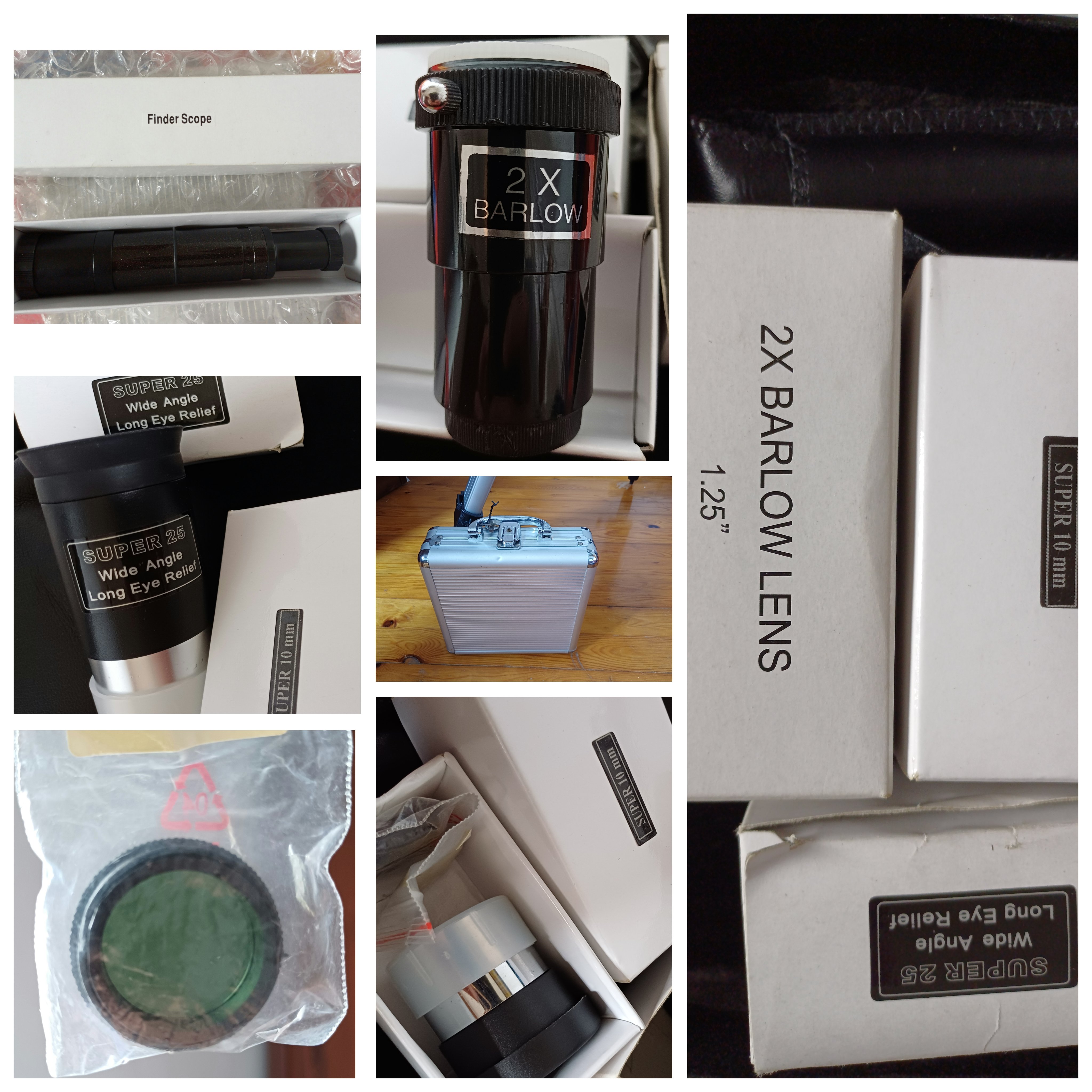 Ελαφρώς μεταχειρισμένο σε άριστη κατάσταση (όλα τα αντικείμενα στις αρχικές τους συσκευασίες). Στο σετ περιλαμβάνονται προσοφθάλμια 25 και 10mm, φίλτρο ηλίου, φίλτρο σελήνης, Barlow 2x, οδηγίες χρήσης στα ελληνικά και ατα αγγλικά, βαλιτσάκι μεταφοράς προσοφθαλμιων και 3 βιβλία (Συλλεκτική έκδοση στα ελληνικά του The Backyard Astronomer's guide).