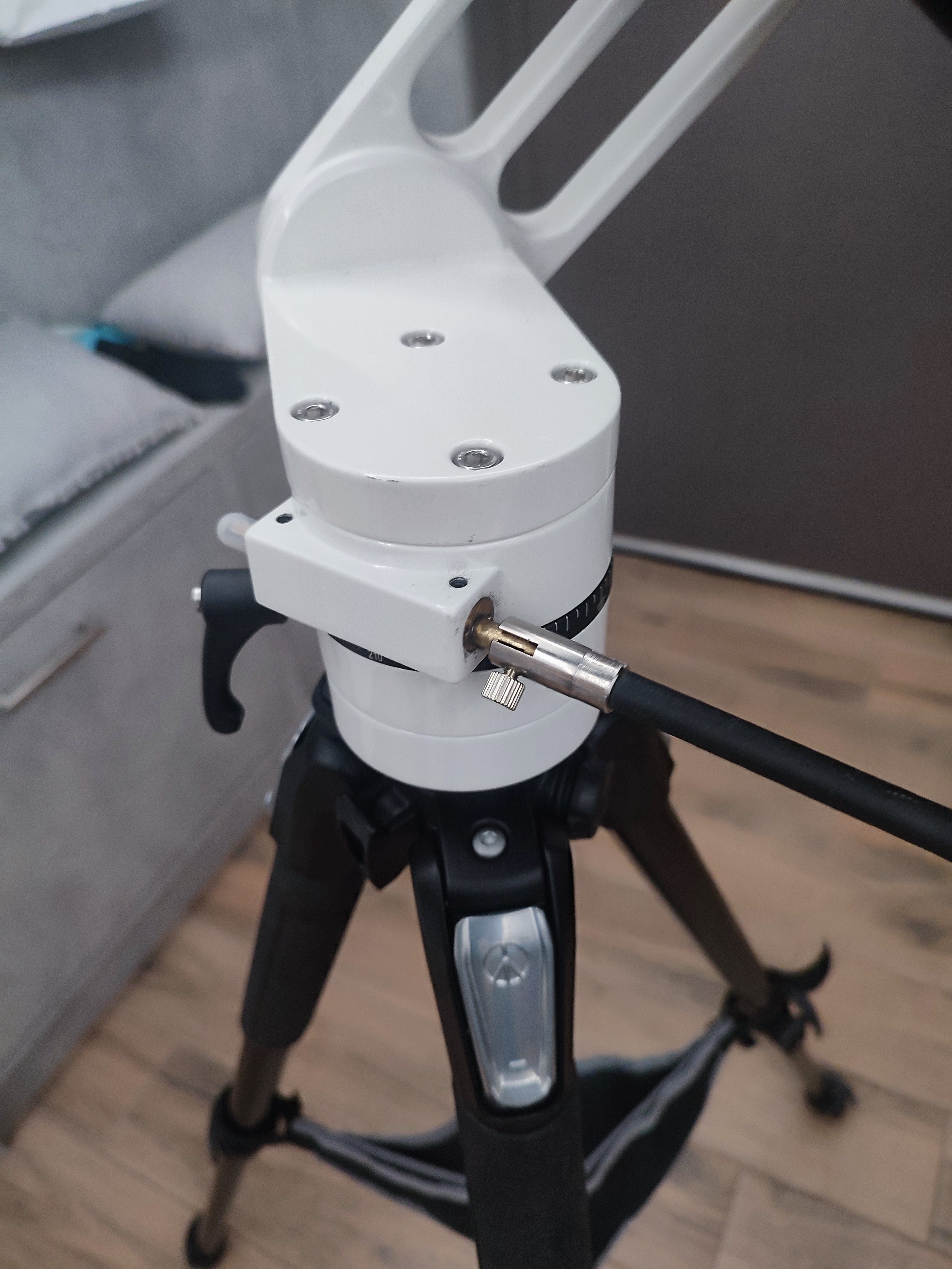 - Συνδέεται σε τρίποδα απλά με 3/8 βίδα. (Ενδεικτικά στη φωτογραφία είναι επάνω σε ένα φωτογραφικό τρίποδο manfrotto).