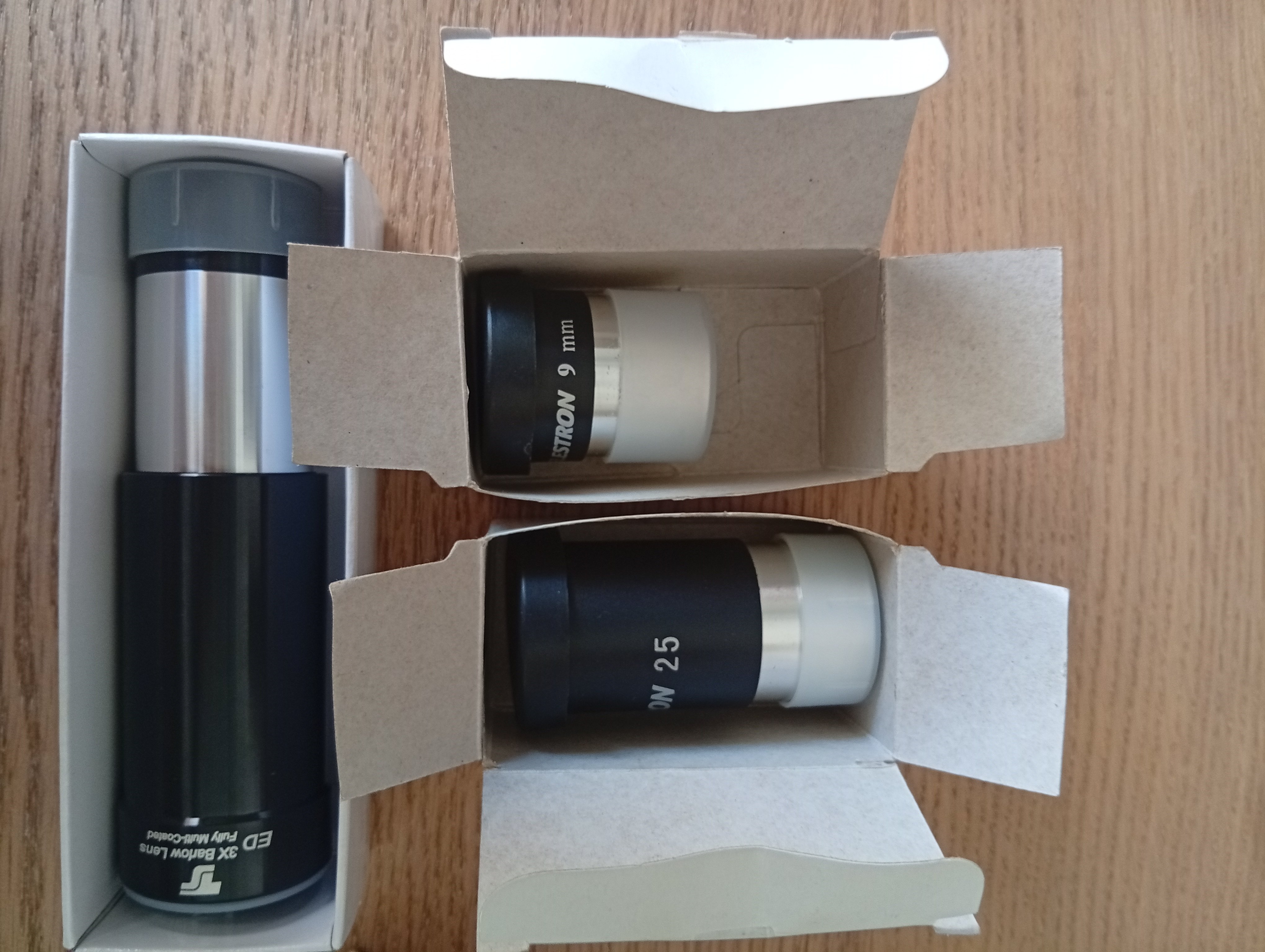 Συμπεριλαμβάνονται δύο προσοφθάλμια διαφορετικής εστιακής απόστασης, για εναλλαγή μεγεθύνσεων που διπλασιάζονται οι δυνατές μεγεθύνσεις με χρήση του φακού Barlow.