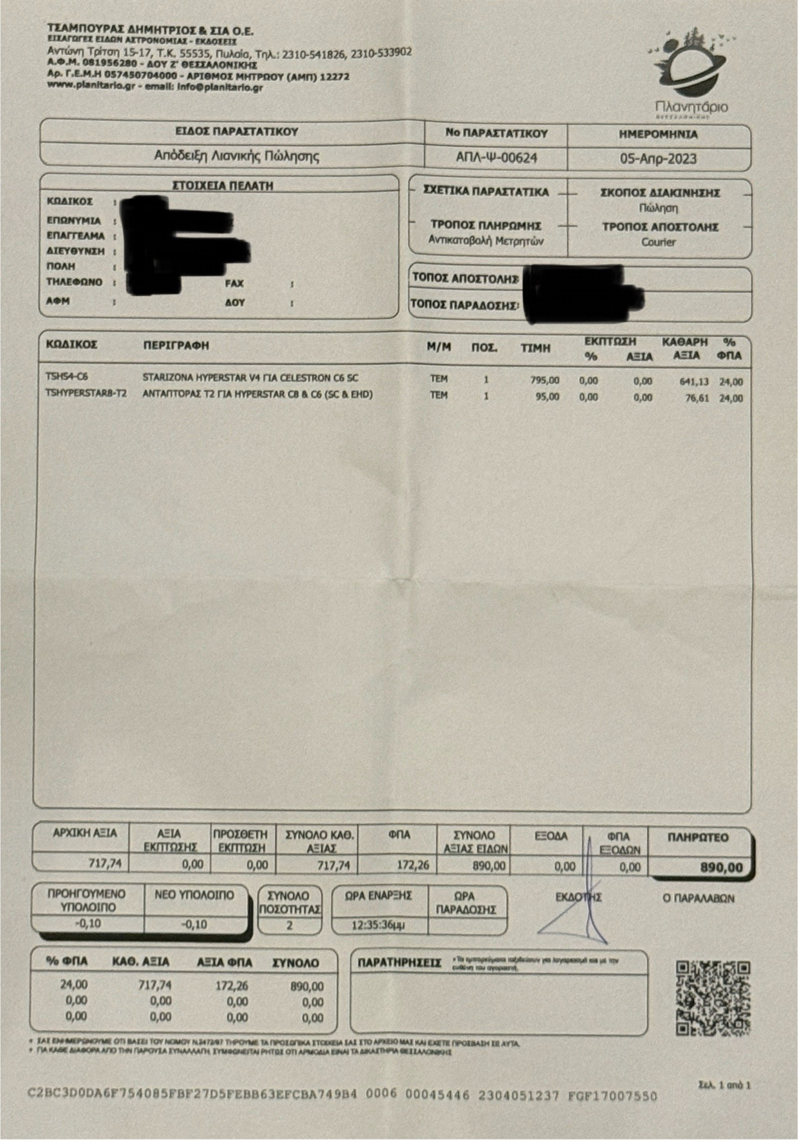 Πωλείται Starizona Hyperstar C6v4 F/2 f=300mm σαν καινούργιο, το δίνω λόγω έλλειψης χρόνου για να ασχοληθώ . Έχει χρησιμοποιηθεί μόνο μια φορά εντός πόλης για δοκιμή . Περιοχή Πειραιάς.