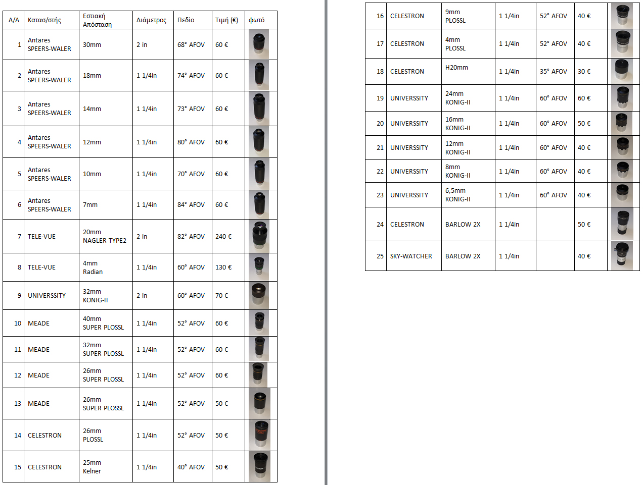 Πωλούνται 15 προσοφθάλμια και 2 Barlow 2X , σύμφωνα με τα στοιχεία της λίστας σε μορφή εικόνας.