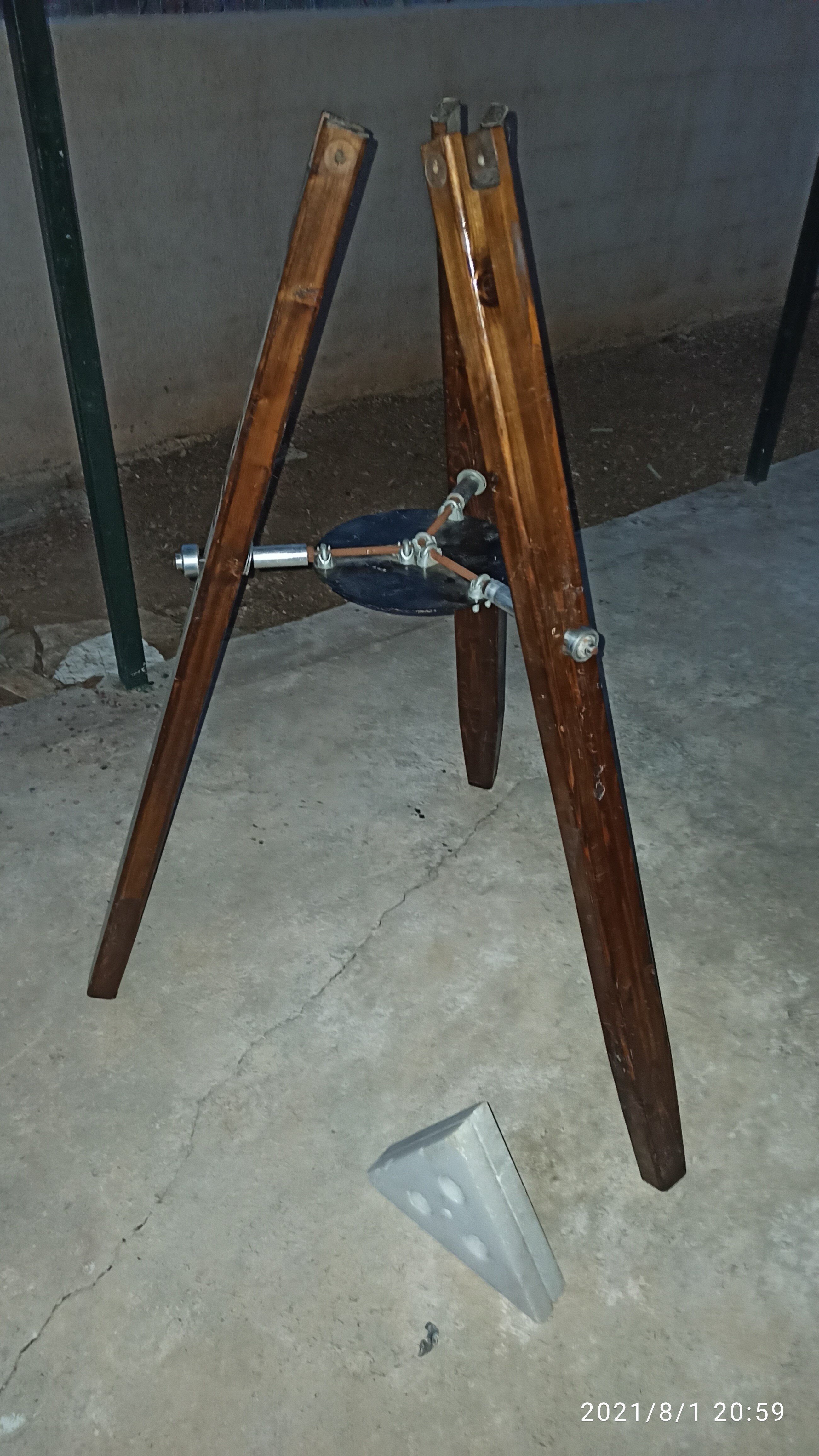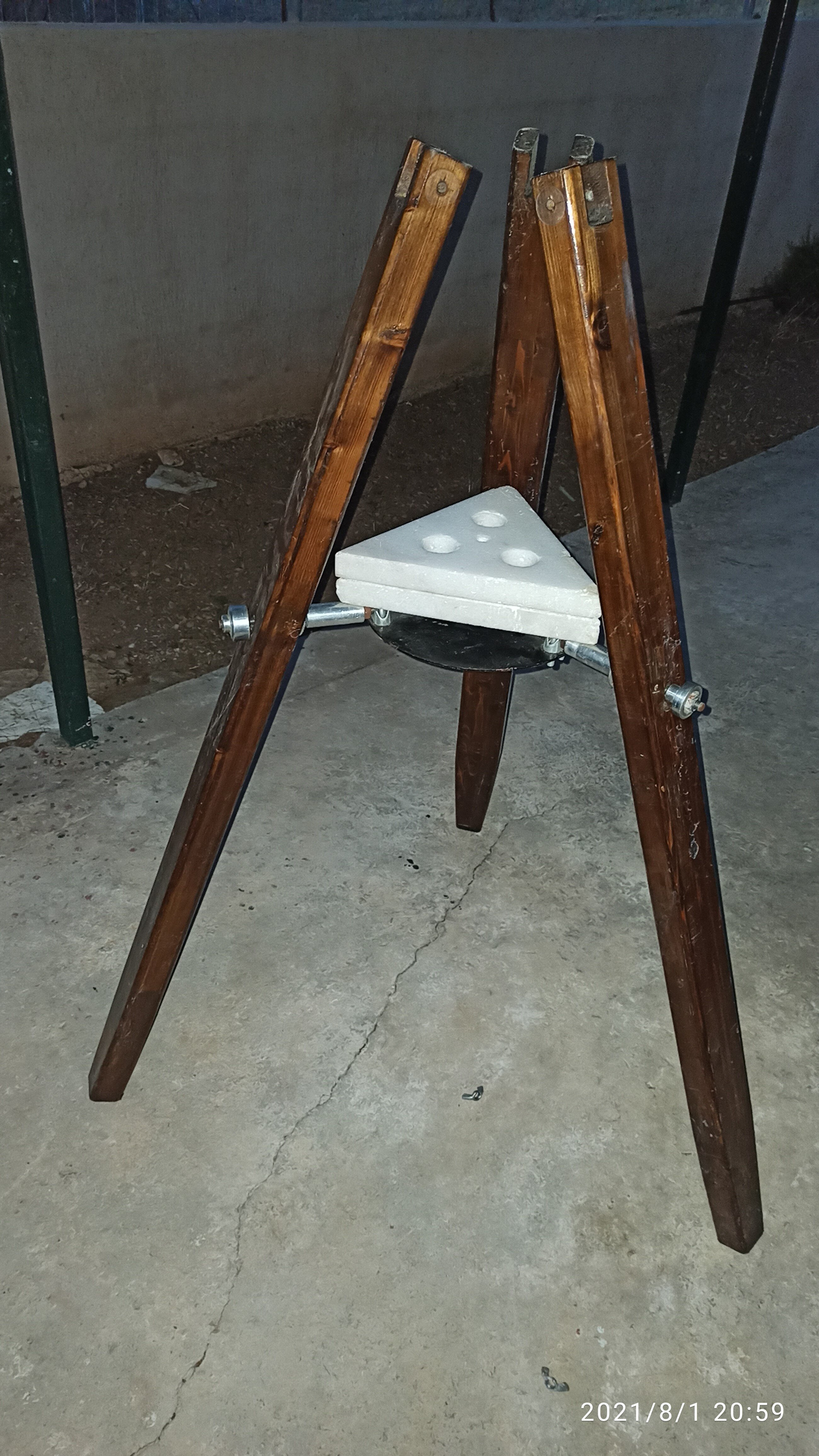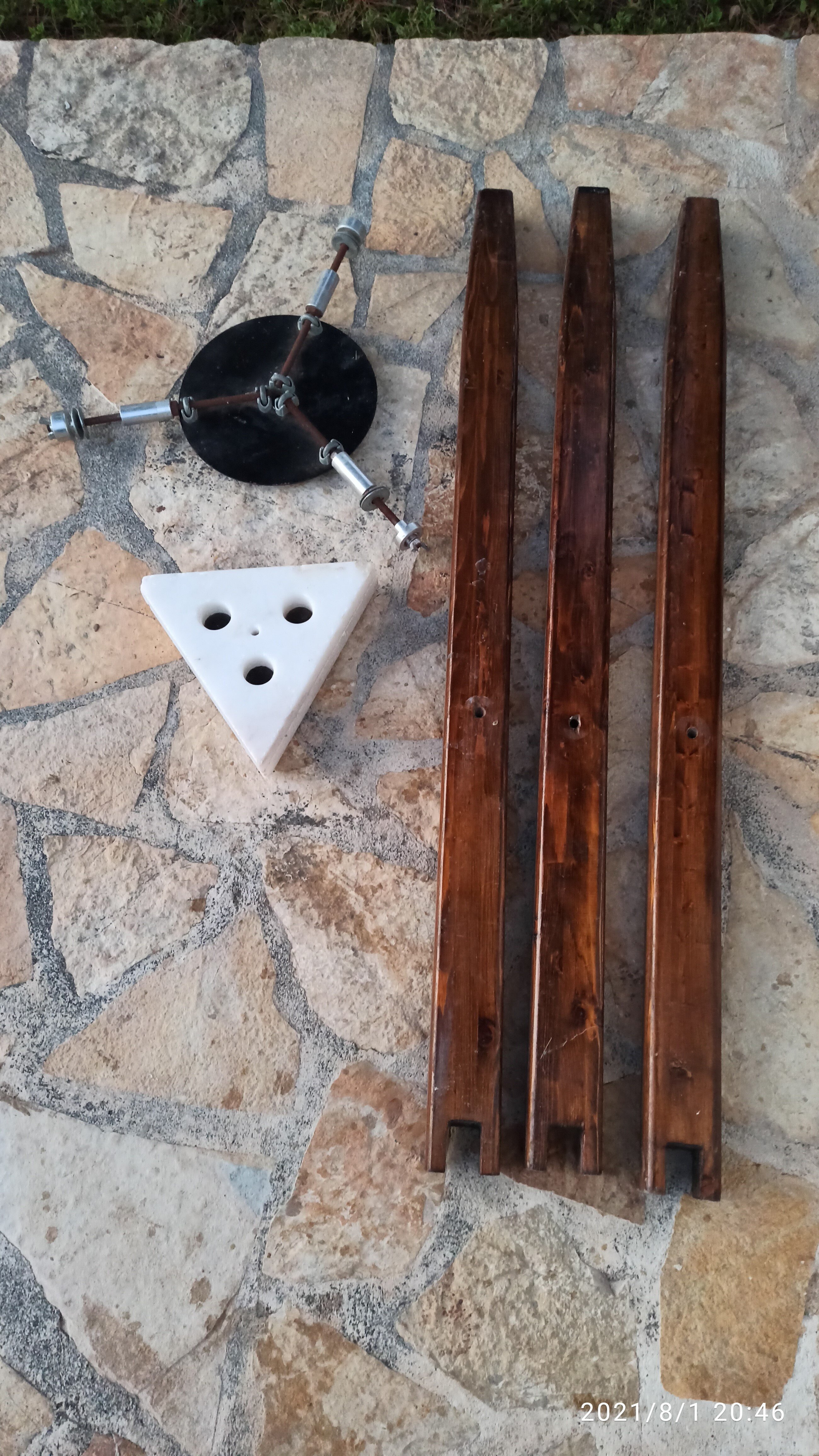 Ιδιοκατασκευή που έγινε με πολύ αγάπη πριν ~25 χρόνια με σκοπό να αποκτήσει μια στιβαρή βάση ο αλουμινένιος τρίποδας της κεφαλής Meade LXD-500. Η βάση με το τηλεσκόπιο πουλήθηκε και μου έμεινε ο τρίποδας ο οποίος με μικρές παρεμβάσεις μπορεί να νατικαταστήσει οποιδήποτε αλουμινένιο τρίποδο. Το τριγωνικό μάρμαρο δίνει μεγαλύτερο βάρος και προσφέρει τρεις θήκες για προσοφθάλμια. Οι ντίζες έχουν λιγη σκουριά αλλά με λίγο καθαρισμα λάδωμα θα είναι μια χαρά.