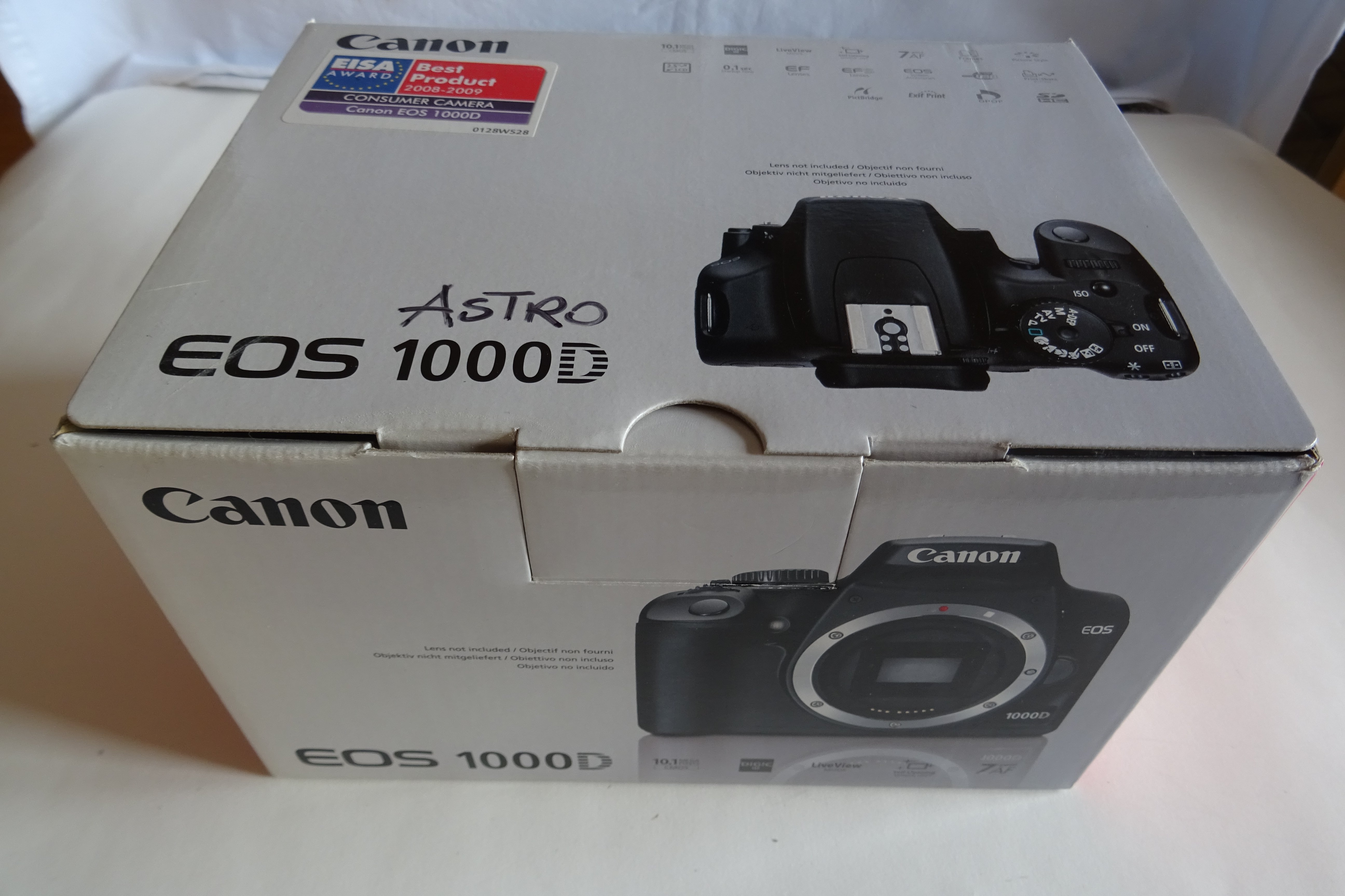 Canon 1000Da τροποποιημένη για αστροφωτογραφία deep-sky (το φίλτρο UV/IR έχει αντικατασταθεί) στο teleskop-express (Γερμανία). Είναι σε άριστη εμφανισιακή και λειτουργική κατάσταση. Η φωτογραφία του IC434 (εδώ σε χαμηλή ανάλυση) έχει ληφθεί με αυτήν την κάμερα προσαρμοσμένη στο Takahashi FSQ-106. Ενδείκνυται ωστόσο για τηλεσκόπια με μεγαλύτερη εστιακή απόστάση (πχ Celestron C8 f/10 ή σε f/6.3 με χρήση focal reducer) λόγω μεγαλύτερου μεγέθους των pixel σε σχέση με πιο καινούριες DSLRs, ανάλογα πάντα και με τις ατμοσφαιρικές συνθήκες και άλλους παράγοντες (πχ σταθερότητα ρομποτικής βάσης, guiding, post-processing, κ.λπ.). Περιλαμβάνεται το κορυφαίο IDAS LPS-P2-FF clip-in φίλτρο για την φωτορύπανση. Δίνονται: - Canon 1000Da - IDAS LPS-P2-FF clip-in light pollution filter - 4 batteries - charger - 2 cables - (δεν περιλαμβάνεται SD memory card)