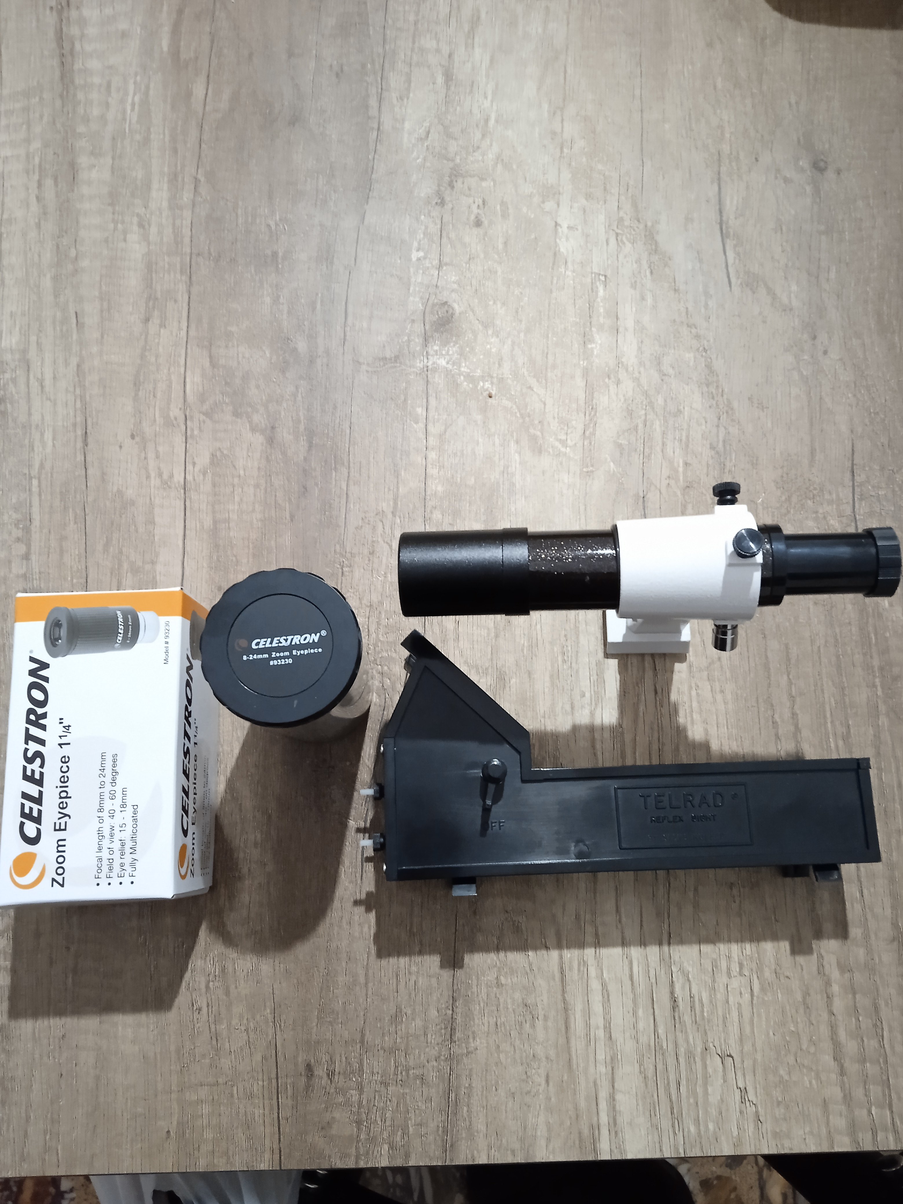Πωλειται το ζουμ προσοφθαλμιο της celestron εχει εξαιρετικες κριτικες στο εξωτερικο ειναι απο 8 εως 24 χιλιοστα οι μεγεθυνσεις του και ειναι ενα προσοφθαλμιο για καλη παρατηρηση με αρκετα μεγαλο πεδιο επισης δινεται ο telrad και ο ερευνητης 6 επι 30 μαζι με τον βραχίονα. Ολα ειναι χρησιμοποιημενα μια φορα σε κατασταση και καινουριου