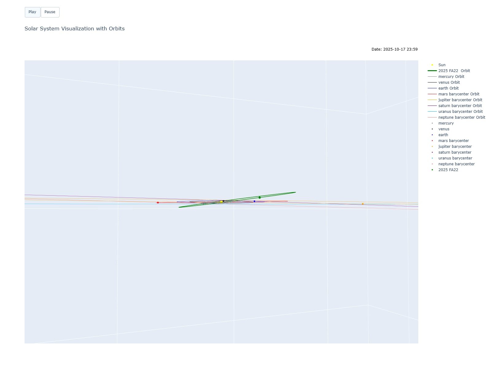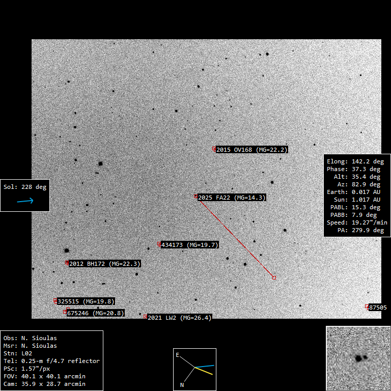 Ο αστεροειδής 2025 FA22 είναι ένας δυνητικά επικίνδυνος αστεροειδής, Potentially Hazardous Asteroid PHA) , ο οποίος στο πιο κοντινό του πέρασμα από τη Γη, στις 18 Σεπτεμβρίου 2025 07:42 UTC, βρέθηκε σε απόσταση 841.988 km. Το μέγεθός του κυμαίνεται από 130 - 290 m και η περίοδος περιστροφής του είναι 676 περίπου ημέρες. Ανακαλύφθηκε από το τηλεσκόπιο Pan-STARRS 2 το Μάρτιο του 2025, και το μέγεθός του τον ανέδειξε αρκετά ψηλά στην Risk List της ESA. O αστεροειδής αποτέλεσε άλλον έναν στόχο για την International Asteroid Warning Network (IAWN) και τα μέλη της, για μετρήσεις αστρομετρίας, φωτομετρίας, σπεκτροσκοπίας, πολωσιμετρίας και άλλων μεθόδων που θα βοηθήσουν στην καλύτερη κατανόηση της φύσης του αντικειμένου. Απώτερος στόχος βέβαια είναι η παγκόσμια κοινότητα πλανητικής άμυνας να δοκιμάσει την ικανότητά της να μετράει την τροχιά και τα φυσικά χαρακτηριστικά ενός μεγάλου αστεροειδούς που διέρχεται σχετικά κοντά στη Γη, και να συντονίσει τη συνεργασία και την ανταλλαγή πληροφοριών μεταξύ των μελών της. Το αστεροσκοπείο ΝΟΑΚ συμμετείχε στην καμπάνια με αστρομετρικές μετρήσεις οι οποίες κατατέθηκαν στις αρμόδιες υπηρεσίες. Με μέγεθος κοντά στα 20 mag πλέον ο 2025 FA22, αποτελεί αντικείμενο μελέτης μόνο των μεγάλων επίγειων αστεροσκοπείων και τα αποτελέσματα της εκστρατείας θα γίνουν γνωστά τους επόμενους μήνες . Α1.mp4 Α2.mp4 - Σήμερα