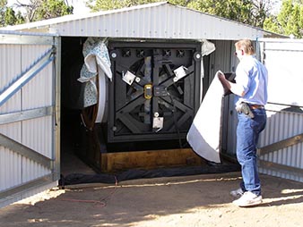 kkokkolis Δημοσιεύτηκε Φεβρουάριος 29, 2012 Συγγραφέας Δημοσιεύτηκε Φεβρουάριος 29, 2012 22" Newtonian binocular, B. D. Sayre, 2010 Key features: 22" f5 Newtonian binocular telescope on an alt-az mount9½' tall, with center of gravity 16" above ground to minimize eyepiece heightEconomical use of materials through a minimalist design338 pounds total weight, including lead counterweights48 pound, 1⅝" thick primaries, 4½" secondaries, 2" tertiariesMirrors are glued to triangular cells to simplify cell structureStrut tubes are only ⅝" in diameter, and use midpoint bracing for stiffeningSpiders are made with 12 strands of .02" wireC-rings are mounted inboard to minimize azimuth and ground ring diameterAdjustments to converge both sides into optical parallelism are separate from — and do not compromise — collimation2" eyepieces are supported with a wide range of interpupillary adjustment Οὖτιν με κικλήσκουσι My Optics