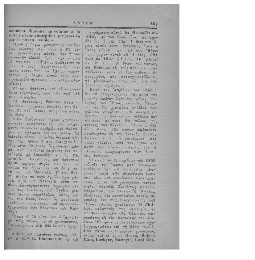 Mich Δημοσιεύτηκε Αύγουστος 11, 2010 Συγγραφέας Δημοσιεύτηκε Αύγουστος 11, 2010 61. Μοσχόπουλου Ν., «Ο Πλανήτης Άρης», δημοσιεύθηκε στην εβδομαδιαία έκδοση του Νεολόγου της Κωνσταντινουπόλεως, Τ. 3, τευχ. 32, σσ. 633-636, το 1894. Μια σελίδα Orion Amateur Observatory LangadasGSO-ASTROTECH 16,Meade LXD 55 S/N 8,S/W ED 100, William Optics Zenith StarED 70/420,Guide Scope :Meade 70/600,TS Guide Finder 9x60,Celestron SkyMaster 15x70,Bresser 10x50,