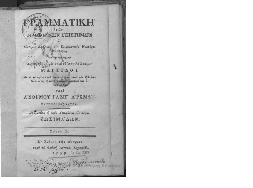 Mich Δημοσιεύτηκε Αύγουστος 11, 2010 Συγγραφέας Δημοσιεύτηκε Αύγουστος 11, 2010 71. Άνθιμου Γαζή Αρχιμ. εκ Θεσσαλίας – μετάφραση, «Γραμματική των Φιλοσοφικών Επιστημών», τομ. Β’, στο κεφάλαιο «Περί Γεωλογίας» περιέχει πληροφορίες για τον Ήλιο, εκδόθηκε στη Βιέννη το 1799. Μια σελίδα Το εξώφυλο Orion Amateur Observatory LangadasGSO-ASTROTECH 16,Meade LXD 55 S/N 8,S/W ED 100, William Optics Zenith StarED 70/420,Guide Scope :Meade 70/600,TS Guide Finder 9x60,Celestron SkyMaster 15x70,Bresser 10x50,