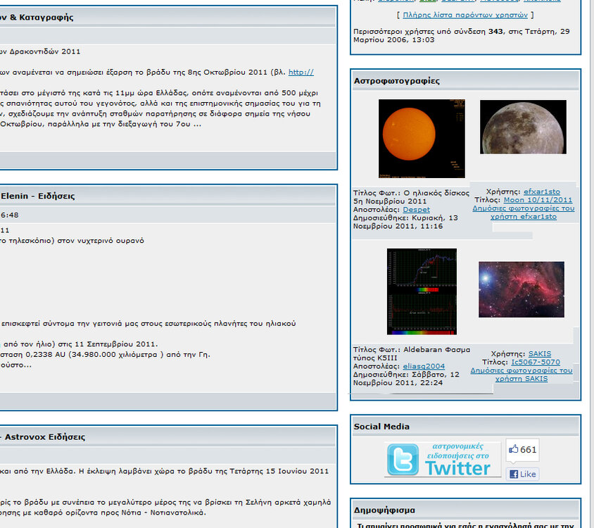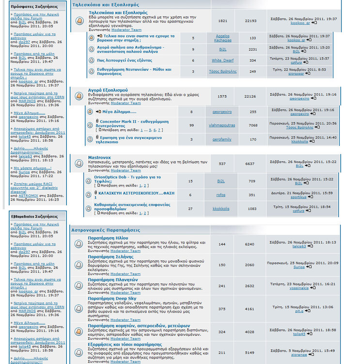 Κατερινα Δημοσιεύτηκε Δεκέμβριος 1, 2011 Δημοσιεύτηκε Δεκέμβριος 1, 2011 θα ξεκινήσω από την πρώτη σελίδα, γιατί χρησιμοποιώ τις "πρόσφατες συζητήσεις" για να διαβάσω τις νέες δημοσιεύσεις και όχι το forum του μενού στο πάνω μέρος της σελίδας. ***θα προτιμούσα οι ειδήσεις στο κέντρο της σελίδας να μην καταλαμβάνουν τόσο πολύ χώρο γιατί τις περισσότερες φορές θυμίζουν… αρχαία ιστορία κι όχι "φρέσκα νέα".***Μάλιστα θα πρότεινα να μην είναι καν στο κέντρο αλλά να είναι εκεί που βρίσκονται οι πρόσφατες συζητήσεις.***θα μου άρεσε επίσης να υπάρχει ένα εικονίδιο που να δείχνει τη φάση της σελήνης. Ίσως κάπου πάνω δεξιά, κοντά στο καλωσόρισμα του επισκέπτη.***Στο κεντρικό μενού ή στα περιεχόμενα, να προστεθεί download που θα σε οδηγεί σε μια σελίδα με χρήσιμα αρχεία που έχουν φτιάξει τα μέλη του astrovox και κάνεις αμάν για να τα ξαναβρείς. Αν μπει στο κεντρικό μενού να αφαιρεθεί το «συνδεθείτε για να ελέγξετε την αλληλογραφία σας» που πιάνει και μπόλικο χώρο.***Θα ήθελα να υπάρχει η δυνατότητα να επιλέγω τον τρόπο που θα μου παρουσιάζονται οι δημοσιεύσεις π.χ. να μην μου παρουσιάζεται πρώτο το θέμα βάση της τελευταίας απάντησης αλλά βάση της πιο πρόσφατης συζήτησης που ανοίχθηκε.***Στο κάτω μέρος οποιασδήποτε σελίδας να υπάρχει η επιλογή «κεντρική σελίδα».***Ειδική ενότητα για αρχάριους με έξτρα οδηγίες προς αστροναυτιλλομένους. Από εκεί και πέρα οποιεσδήποτε αλλαγές σχετικές με χρώματα, εικονίδια κλπ. είναι καλοδεχούμενες. Λέω όχι σε κατηγορία οφφτόπικ, γιατί εδώ τσακωνόμαστε για θέματα αστρονομικού χαρακτήρα, δεν θα γίνουμε μπάχαλο στα άλλα (πολιτικά, ποδοσφαιρικά, θρησκευτικά κλπ);Όσο για το τσατ, όπως έχουμε πει κι άλλες φορές, τσατ υπάρχει, συμμετοχή δεν υπάρχει (κι είναι λογικό με τόσα νέα μέσα κοινωνικής δικτύωσης). Καλό κουράγιο
