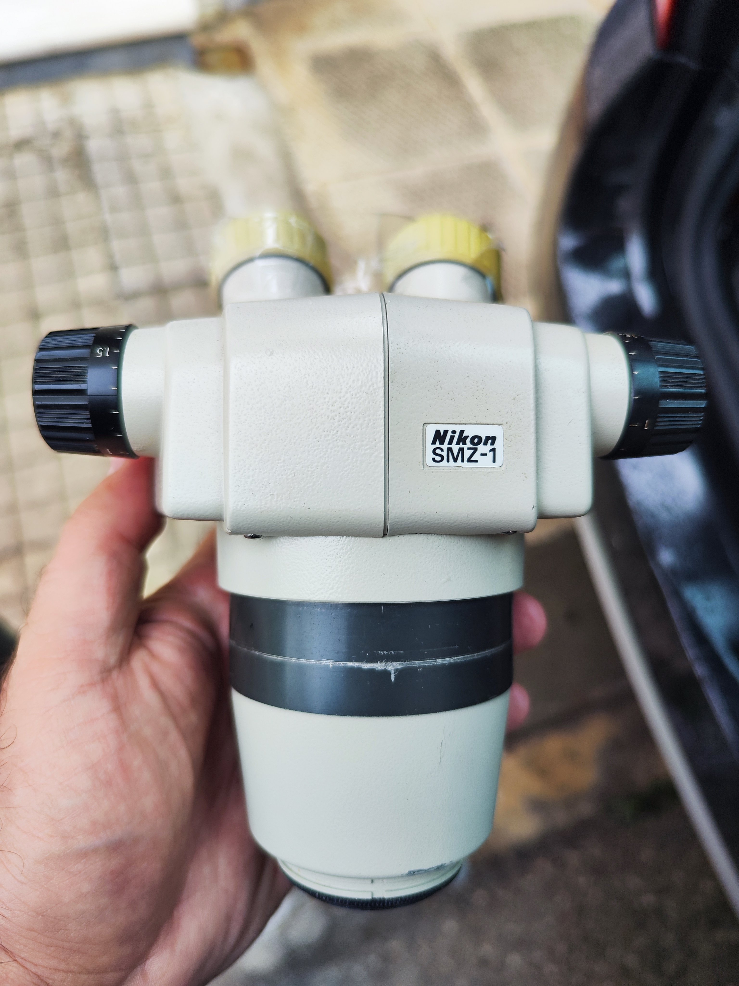 kkokkolis Δημοσιεύτηκε Νοέμβριος 13, 2024 Συγγραφέας Δημοσιεύτηκε Νοέμβριος 13, 2024 (επεξεργάστηκε) Αποφάσισα να δοκιμάσω και έναν Zoom, για τις χαμηλές μεγεθύνσεις. Το Nikon SMZ-1 είναι το εισαγωγικό της Nikon, με μεγέθυνση 0.7-3x, δηλαδή 7-30x με 10x φακούς. Θα χρησιμοποιηθεί κυρίως στο 10x και αρχικά μάλιστα στο χέρι. Ο κύριος που μου το πούλησε είναι επαγγελματίας, επισκευαστής iPhone. Είχε μια ντουζίνα στερεοσκοπικές κεφαλές σε 3-4 βάσεις με κάθε είδους αξεσουάρ, ανάμεσά τους Leica και Zeiss, θηρία. Μου είπε πως ξεκίνησε με αυτό αλλά επενδύει στα καλύτερα επειδή περνά 8 ώρες δουλεύοντας μέσα από τα μικροσκόπια και χρειάζεται και απόσταση εργασίας για το κολλητήρι (που επιτυγχάνεται με μειωτές 0.5x) και άφθονο φως (ring LEDs) και μεγάλες μεγεθύνσεις (ως 75x) και πεδίο και απ' όλα. Το εργαστήριο έμοιαζε με Luna Park για εμένα. Το επεξεργάστηκε Νοέμβριος 13, 2024 ο kkokkolis Οὖτιν με κικλήσκουσι My Optics