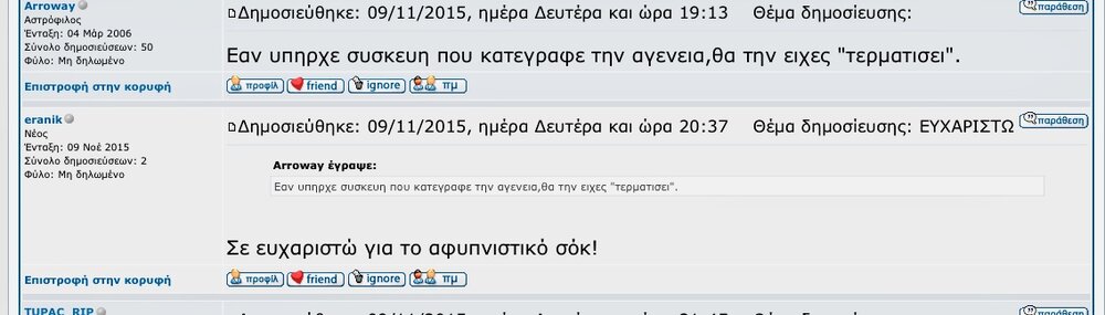 fotodektis Δημοσιεύτηκε Ιανουάριος 22, 2018 Δημοσιεύτηκε Ιανουάριος 22, 2018 1)Αγαπητέ Δημήτρη,ευχαριστώ ειλικρινά για τους εύστοχους προβληματισμούς σου!Δίνεις έναυσμα για δημιουργική συζήτηση,που πιστεύω οτι δεν είναι χάσιμο χρόνου,ούτε εκτός θέματος!Όπως καταλαβαίνεις,επιστημονικές αποδείξεις δεν υπάρχουν για καμία θέση-προς το παρόν,εμπειρίες δεν μπορούν να κοινωνηθούν-μεταβιβαστούν,η επικοινωνία θα γίνει αναγκαστικά σε φιλοσοφικό-επιστημολογικό επίπεδο...Λόγω άλλων υποχρεώσεων όμως,επιφυλάσσομαι να απαντήσω στις επόμενες μέρες.2)Πρός όλους όσους ενεπλάκησαν στην συζήτηση,έχω να τονίσω οτι το θέμα δεν είναι ''αθώο'',έχει επικίνδυνες παραμέτρους τις οποίες εύχομαι να μην γνωρίσετε ποτέ,όπως κάποιοι άλλοι,αν δεν είστε επαρκώς ''προστατευμένοι''.Το τι σημαίνουν τα εντός εισαγωγικών,εφόσον δεν υπάρχουν κοινές εμπειρίες,δεν μπορούν να κατανοηθούν,δεν υπάρχουν δυστυχώς ''δίαυλοι'' επικοινωνίας...3)Είναι ωραίες οι συζητήσεις κάτω απο τα αστέρια,ατενίζοντας τον ουρανό,που μας γοητεύει όλους!Με μπύρες,κρασί,ρακί και ό,τι άλλο ''καύσιμο'' υπάρχει...και συμπέρασμα να μην βγεί,αρκεί η παρέα,η επικοινωνία και οι ανθρώπινες σχέσεις που είναι το σημαντικότερο...Φιλικά και εγκάρδια-Κώστας "Δεν γνωρίζεις τίποτα,μέχρι να εξασκηθείς σε αυτό" Richard P.Feynman"Πάσα επιστήμη χωριζομένη αρετής,πανουργία,ού σοφία φαίνεται" Πλάτων Αλήθεια <=> Αγάπη[Ταπεινότητα[Δικαιοσύνη]]