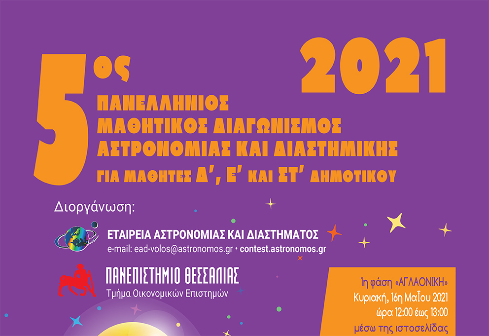 astrovox Δημοσιεύτηκε Μάιος 11, 2021 Δημοσιεύτηκε Μάιος 11, 2021 Την ερχόμενη Κυριακή, 16η Μαΐου 2021, και ώρα 12:00 – 13:00 διεξάγεται διαδικτυακά η 1η φάση «Αγλαονίκη» του 5ου Πανελληνίου Μαθητικού Διαγωνισμού Αστρονομίας και Διαστημικής 2021. Ο Διαγωνισμός διοργανώνεται από το Πανεπιστήμιο Θεσσαλίας και την Εταιρεία Αστρονομίας και Διαστήματος. Στο διαγωνισμό μπορούν να λάβουν μέρος μαθητές και μαθήτριες της Δ΄, Ε΄ και ΣΤ΄ τάξης του Δημοτικού. Σκοπός του διαγωνισμού είναι η περαιτέρω ενασχόληση και εμβάθυνση των μαθητών στην επιστήμη της Αστρονομίας και της Διαστημικής και η επιβράβευση της ενδόμυχης και διερευνητικής αυτής προσπάθειάς τους. Δευτερεύων σκοπός είναι η προετοιμασία των μαθητών του Δημοτικού για να συμμετάσχουν αργότερα στον Πανελλήνιο Μαθητικό Διαγωνισμό Αστρονομίας και Διαστημικής, που εδώ και 26 χρόνια διενεργεί η Εταιρεία Αστρονομίας και Διαστήματος τόσο για το Λύκειο, όσο και για το Γυμνάσιο.Δηλώσεις συμμετοχής στο διαγωνισμό γίνονται στον ιστότοπο του Διαγωνισμού: contest.astronomos.gr μέχρι την Πέμπτη, 13η Μαΐου 2021. Οι περίπου 30 καλύτεροι της 1ης φάσης θα έχουν το δικαίωμα να συμμετάσχουν στη 2η φάση του διαγωνισμού, η οποία θα πραγματοποιηθεί στο Βόλο την Κυριακή, 11 Ιουλίου 2021 (αντί της Κυριακής, 13 Ιουνίου 2021) λόγω της παράτασης του σχολικού έτους μέχρι τις 25/6/21, που αποφάσισε το Υπουργείο Παιδείας. Τα ονόματα των προκρινόμενων θα αναρτηθούν στην ιστοσελίδα του Διαγωνισμού (contest.astronomos.gr) εντός εύλογου χρονικού διαστήματος.Τα βραβεία και τα έπαθλα του διαγωνισμού θα είναι δύο τηλεσκόπια (για τον 1ο και τον 2ο νικητή) και ένα ζευγάρι ισχυρά κιάλια (για τον 3ο νικητή) (ευγενική χορηγία του παλαιού πρωτεύσαντα του Διαγωνισμού Αστρονομίας του Λυκείου, κ. Ι. Καμαρέτσου). Θα δοθούν ακόμη αστρονομικά βιβλία των εκδόσεων της Εταιρείας, ενώ θα κληρωθεί και ένα τηλεσκόπιο (ευγενική χορηγία του Πλανηταρίου Θεσσαλονίκης του κ. Δ. Τσάμπουρα) μεταξύ των περίπου 15 μαθητών (εκτός των 2 πρώτων) που θα πετύχουν στη 2η φάση «Υπατία» του διαγωνισμού. «I have loved the stars too fondly to be fearful of the night». Sarah Williams, The Old Astronomer