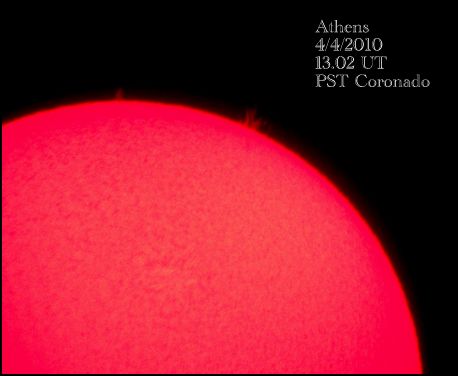 tsan Δημοσιεύτηκε Απρίλιος 13, 2010 Δημοσιεύτηκε Απρίλιος 13, 2010 Καλημέρα στο ΔΗΔ! Σήμερα έχουμε μία ΠΡΟΕΞΟΧΗ ΤΕΡΑΣ στα δυτικά-βορειοδυτικά του δίσκου! Αυτή τη στιγμή (9:10 τοπική) βρίσκεται στη θέση 7 περίπου του δίσκου!!Πρέπει όλοι οι παρατηρητές να δούνε αυτή τη προεξοχή!!!!! Μεταβάλλεται γρήγορα, για το μικρό διάστημα που την παρατήρησα. Πέτρο, κ. Γιώργο, Παναγιώτη και λοιποί φίλοι περιμένουμε τις παρατηρήσεις σας!!!!Αξίζει τον κόπο!!! Αυτά προς το παρόν Με εκτίμηση tsan