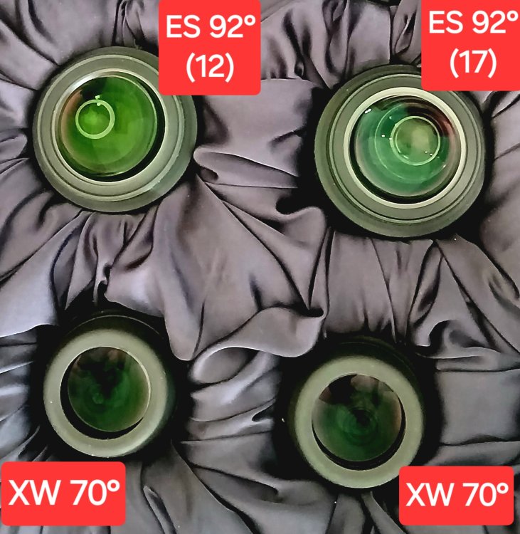 τσιαγκας προδρομος Δημοσιεύτηκε Ιούνιος 4 Δημοσιεύτηκε Ιούνιος 4 (επεξεργάστηκε) Καλημέρα , Δεδομένου ότι θέλεις να μείνεις σε προσοφθάλμια 1,25" η επιλογή του es 24mm 68° είναι πολύ Καλή και θα σου κάλυψη άνετα το μεγάλο κενό μεταξύ του 18 & 35 που έχεις , ενδεχόμενος να σε καλύψει από μόνος του και σαν ερευνητικό κατά κάποιο τρόπο μιας και είναι πολύ κοντά στο tfov του Ultima 35mm που έχεις χωρίς όμως να τον ξεπερνάει, (αυτό θα το δεις στην πράξη συγκρίνοντας και εναλλάσσοντας τα δύο προσοφθάλμια στο ίδιο αντικείμενο ) Με βάση των field stop των φακών Ο 24/68 σου δίνει tfov 0,78° και 85Χ O Ultima 35 σου δίνει tfov 0,82° και 58Χ Αυτό σημαίνει ότι ο 35 Ultima με ελάχιστα μεγαλύτερο κομμάτι ουρανού θα έχει μέσα στο πλάνο λίγο μικρότερο το αντικείμενο . Λόγο της φύσης του stc αναγκαστικά έχεις μικρά πεδία θέασης, αν σκεφτείς στο μέλον να επενδύσεις σε 2" προσοφθάλμιο και 2" διαγώνιο τότε θα ανοίξει ο ουρανός στο τηλεσκόπιο αυτό πχ 35mm panoptic 2" ή es 34/68 2" μετά μισά λεφτά ή es 40/68" ή ακόμη ποιο μεγάλο πεδίο με αρκετά € σε Es 20-25/100° .... Παρακάτω παραθέτω μια φωτό κολάζ με 4 προσοφθάλμια για μια ιδέα πως θα φαίνεται περίπου και τι από το 8" stc και μια φωτό με es 25mm 100° 2" στο Μ44 ανοιχτό σμήνος της φάτνης . ΥΓ) αν αποφασίσεις να αποχωρίστεις radian 18 & Ultima 35 τότε αξίζει μια μικρή στροφή σε 2" εκτός και αν αυτές τις ανάγκες των μεγαλύτερων πεδίων τις καλύπτεις με το dobson 8" f6 οπότε και δεν έχει και τόσο νόημα η στροφή 2" στο stc Το επεξεργάστηκε Ιούνιος 4 ο τσιαγκας προδρομος Καθαρούς ουρανούς