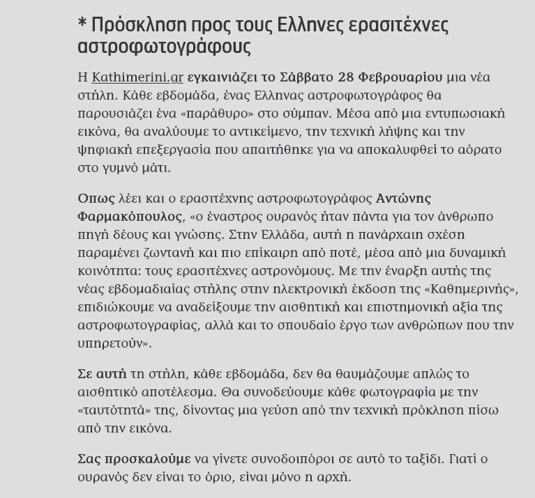 astrovox Δημοσιεύτηκε 14 ώρες πριν Συγγραφέας Δημοσιεύτηκε 14 ώρες πριν Δείτε και το κάλεσμα της Καθημερινής για την εβδομαδιαία στήλη αστροφωτογραφίας που εγκαινιάζει: 3 «I have loved the stars too fondly to be fearful of the night». Sarah Williams, The Old Astronomer