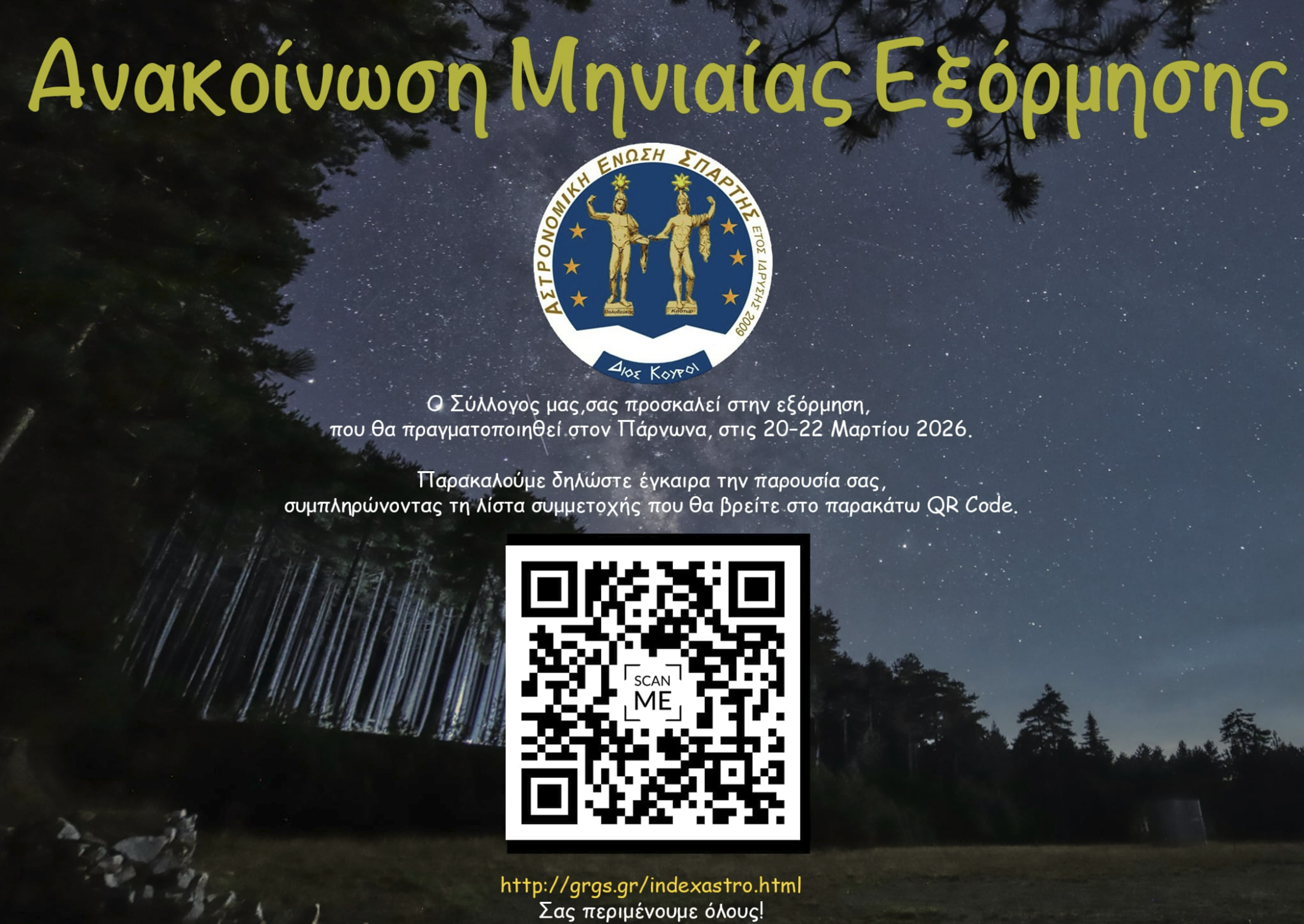 Aggelos Kechagias Δημοσιεύτηκε 1 ώρα πριν Δημοσιεύτηκε 1 ώρα πριν Αγαπητά μέλη, φίλες και φίλοι, Σας προσκαλούμε στην προγραμματισμένη αστροεξόρμηση της ΑΕΣ το ΠΣΚ 20-22/3/2026 στον Πάρνωνα. Παρακαλώ δηλώστε έγκαιρα τη συμμετοχή σας μέχρι την Τετάρτη 18/3 στο σύνδεσμο που ακολουθεί: https://grgs.gr/indexastro.html Το καταφύγιο θα παραμείνει κλειστό οπότε οι επιλογές για διαμονή είναι οι εξής: Σε έναν από τους ξενώνες στον Άγιο Πέτρο. 1 . https://www.hotelparnon.gr/ 2 . "1924" Studios τηλέφωνο επικοινωνίας 6982240905 3. https://www.omalevos.gr/ 4 . Eva’s destination τηλέφωνο επικοινωνίας 6944182431 Εναλλακτικά σε σκηνή ή στο αυτοκίνητο. Εδώ θα βρείτε το στίγμα παρατήρησης. Ο καιρός στα 3 παρακάτω Link: Καιρός 1 Καιρός 2 Καιρός 3 Για οποιαδήποτε άλλη πληροφορία μπορείτε να καλέσετε στα παρακάτω τηλέφωνα: Τρεμούλης Νικόλαος - 697-4645898 Σταματούκος Γεώργιος - 697-9913295 Άγγελος Κεχαγιάς - 694-2709993 Καλή αντάμωση! Άγγελος Κεχαγιάς Γραμματέας ΑΕΣ "ΔΙΟΣ ΚΟΥΡΟΙ" http://pegasusastro.com/