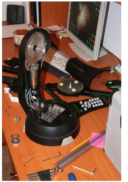KOSTAKIS Δημοσιεύτηκε Δεκέμβριος 16, 2006 Δημοσιεύτηκε Δεκέμβριος 16, 2006 Η εξαγωγη του σωληνα των 8" γινεται σε 15"(!) ενω η τοποθετηση του διοπτρικου απαιτει 10"(!!).Εχει γινει μικρη μηχανουργικη τροποποιηση σε συστημα "Rays Brackets",ωστα να ρυθμιζεται το "μπαλανς" σε απειρες (θεωρητικα) θεσεις.Προβλημα βαρους δεν υφισταται,μια που το διοπτρικο ειναι ελαφρυτερο του καταδιοπτρικου.Ολη η διαδικασια ξεκινησε,επειδη εχω αριστες εντυπωσεις απο την επιδοση της βασης (μηδενικες απαιτησεις ως προς την ακριβεια στησιματος, πολυ καλο go-to και tracking(σε αλτ-αζ λειτουργια)Σε πολικη θεση μου εδωσε ευκολα 60",και η DSLR με συνδιασμο focal reducer 6.3 μου εδωσε εικονα ανωτερη των προσδοκιων μου,παρ οτι οι συνθηκες δεν προσφερονταν για φωτογραφηση.Εδωσα λιγη σημασια σε ρυθμισεις (πανευκολες) που ισως ενδιαφερουν και αλλους κατοχους 8ι. Χωραει και στη βαλιτσα!!!!!(ή ολα θα πανε στραβα,ή ολα πριμα τελικα) Η "ΖΕΝΙΤ"μπηκε για....αντιβαρο για τη ρυθμιση της θεσης του σωληνα,και την επιτευξη ιδανικου μπαλανς. Τα μικρα γραναζακια δεν πρεπει να εχουν "τζογο" μεταξυ τους,γιατι θα εμφανιζεται προβλημα "τζογου" στο μπρατσο.Λασκαρισμα της ρυθμιστικης βιδας,πλησιασμα των γραναζιων,και σφιξιμο.Το μεγαλο παξιμαδι,ρυθμιζει την αντισταση του μπρατσου για "γλυστριματα". Η βαση ετοιμη για ελεγχο-ρυθμιση(αφου θα παει για αστροφωτογραφηση)