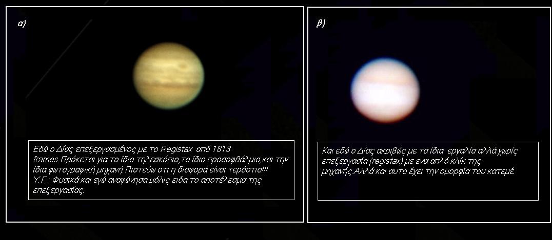 Αυτό με το βίντεο και την επεξεργασία του είναι αναπόφεκτο στην πλανητική φωτογράφιση, το seeing συνεχώς μεταβάλεται και εσύ ψάχνεις το καλήτερο, άρα τραβάς βίντεο, και επείσης με τις πολλές φωτογραφίες βελτιώνεις την ποιότητα και μπορείς να βγάλεις κάτι ακόμα και με μέτριο seeing. Για φαντάσου αυτό με φιλμ...