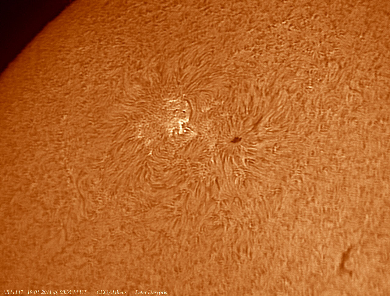 Η επιφάνεια του ΒΑ τμήματος του ηλιακού δίσκου με τη ΑR11147,σε έντονη δραστηριότητα...(Λευκό-λαμπρό τμήμα αριστερά της κηλίδας)