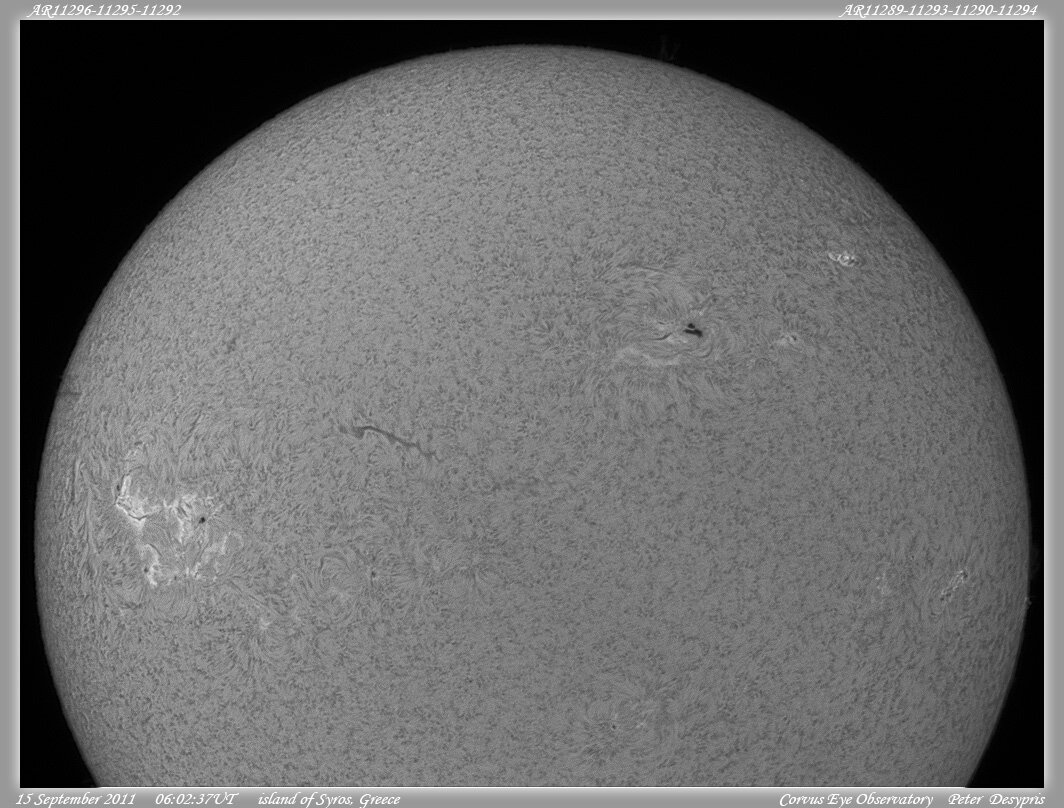 Ο ηλιακός δίσκος με τις πιο ενεργές περιοχές του,κατά την 15-09-2011.Επτά που φαίνονται και μιά που δε φαίνεται...=8..!!!
