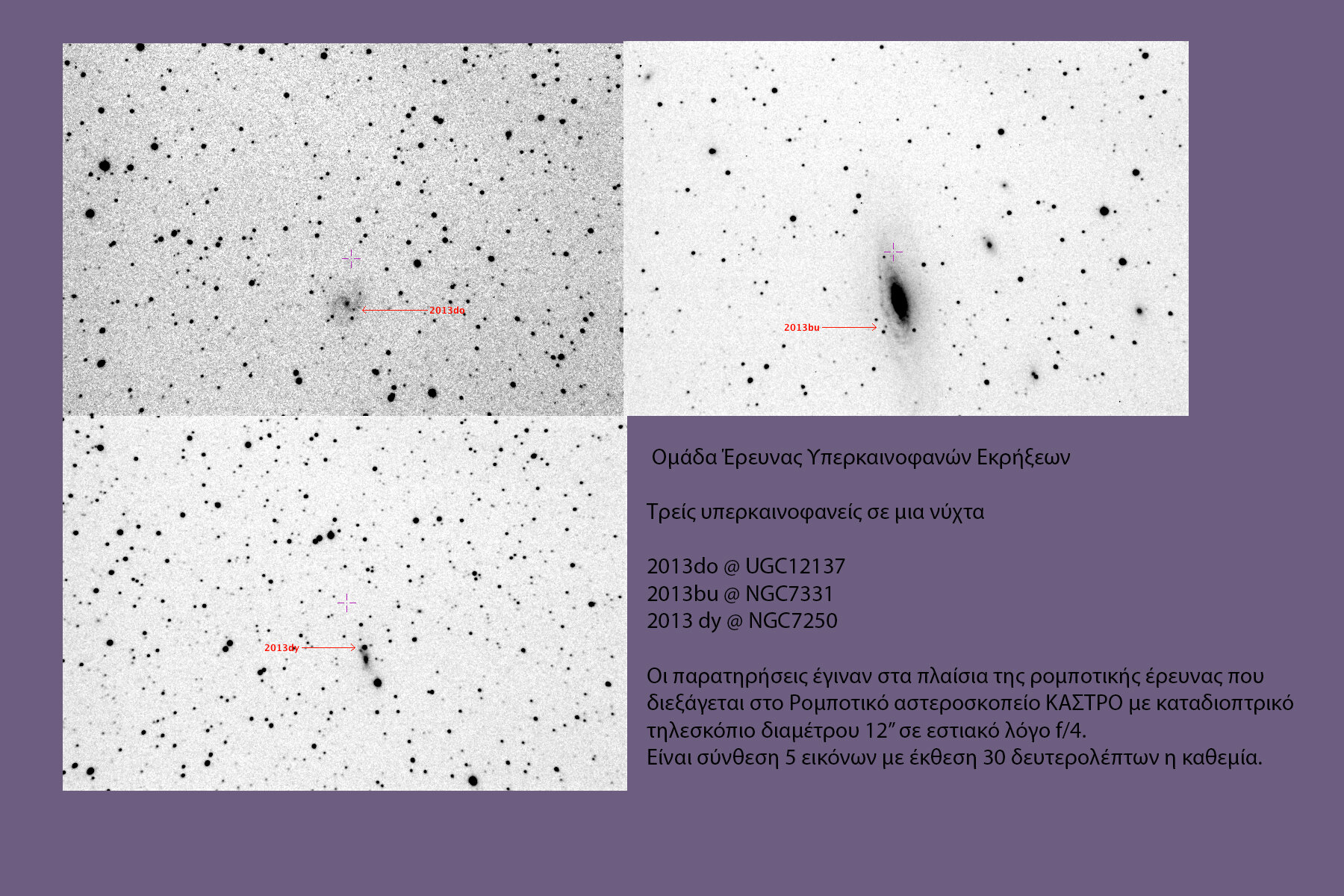 Η Ομάδα Έρευνας Υπερκαινοφανών Εκρήξεων ξεκίνησε την προσπάθεια της το 2003 με σκοπό την ανίχνευση καινούργιων Supernova σε άλλους γαλαξίες. Στα χρόνια που πέρασαν πολλές φορές είχαμε βρεί υπερκαινοφανείς που για μόλις λίγες ώρες, κάποιος άλλος παρατηρητής είχε καταγράψει. Αυτό έγινε και στις 23 Ιουλίου όταν μια μοναδική σύμπτωση μας έφερες τρείς τέτοιες εκρήξεις και έκανε καρδιές και τηλέφωνα να σπάνε!
