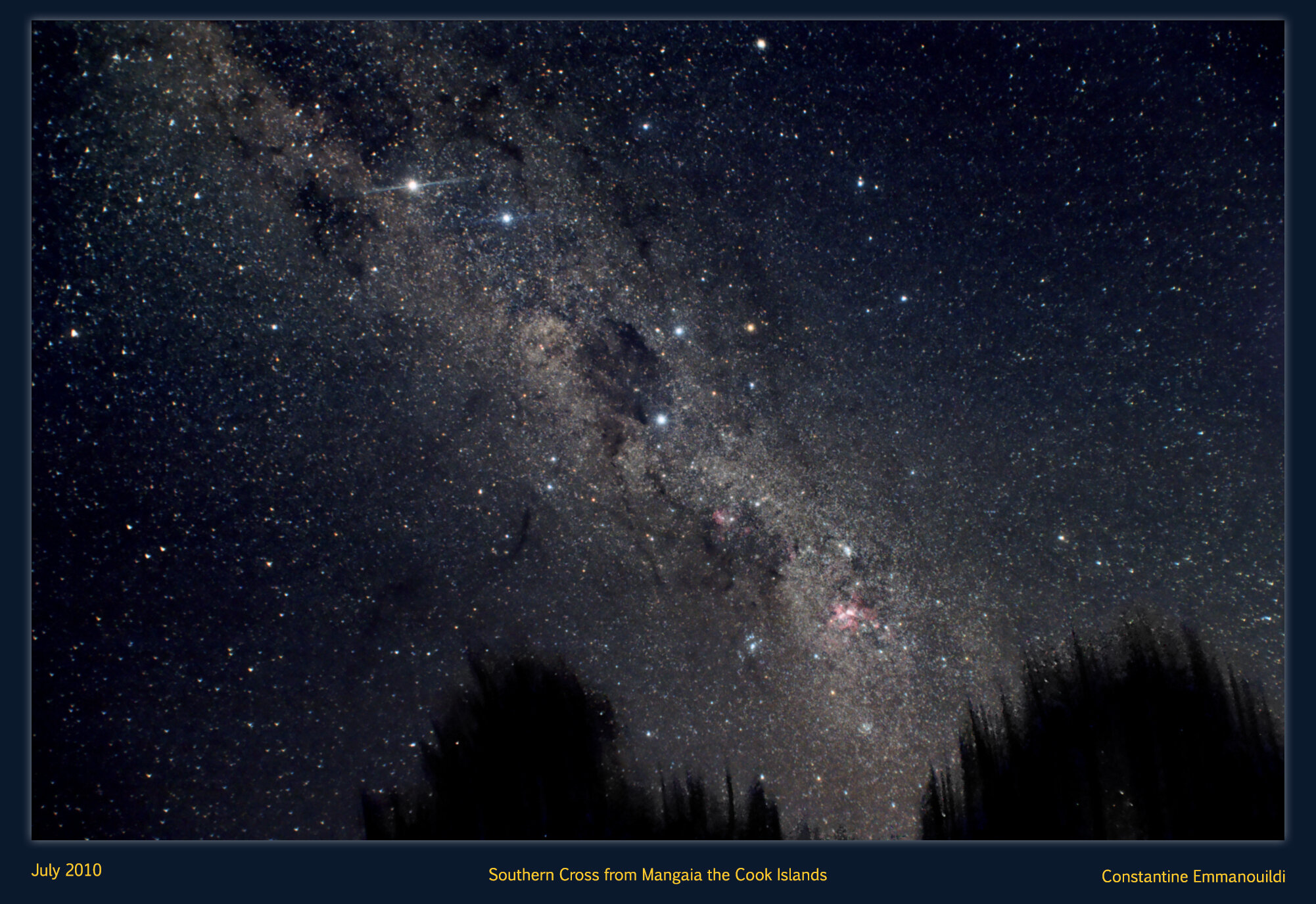 Στο κέντρο της φωτογραφίες διακρίνεται ο αστερισμός του Σταυρού του Νότου με τον γαλαξία στο νότιο ημισφαίριο να βρίθει από σκοτεινά νεφελώματα. Η εικόνα έγινε το 2010 όταν πήγα στα νησιά Κούκ για την ολική έκλειψη ηλίου που συνέβαινε εκεί. Σε εκείνο το μέρος λοιπόν είδα τον πιο σκοτεινό ουρανό της ζωής μου, γεγονός που πιστεύω ότι αποτυπώνεται αρκετά καλά στην συγκεκριμένη φωτογραφία.