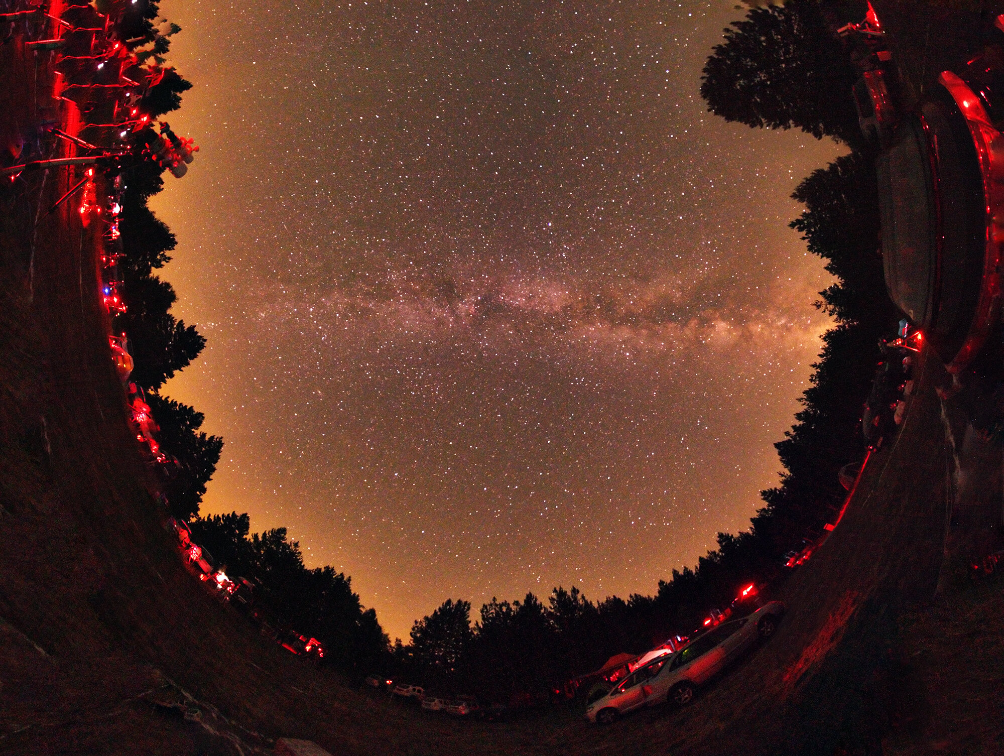 Σκέφτηκα να φτιάξω έναν χάρτη του ουρανού με μια από της κάμερες και έναν υπερευρυγώνιο φακό (8mm) και να τρέξω ένα αυτόματο script στο τηλεσκόπιο για να δω πως διαμορφώνεται το υπόβαθρο από τον ορίζοντα μέχρι το ζενίθ και στα τέσσερα σημεία του. Η εικόνα είναι μια πανοραμική άποψη διορθωμένη σε ένταση από τα δεδομένα του τηλεσκοπίου. Το Sky Quality Meter έδινε 21.33 στις δέκα μοίρες από τον ορίζοντα και 21.84 στο ζενίθ που είναι τεράστια διαφορά για ένα μέρος χωρίς ιδιαίτερη φωτορρύπανση από μη φυσικές πηγές.