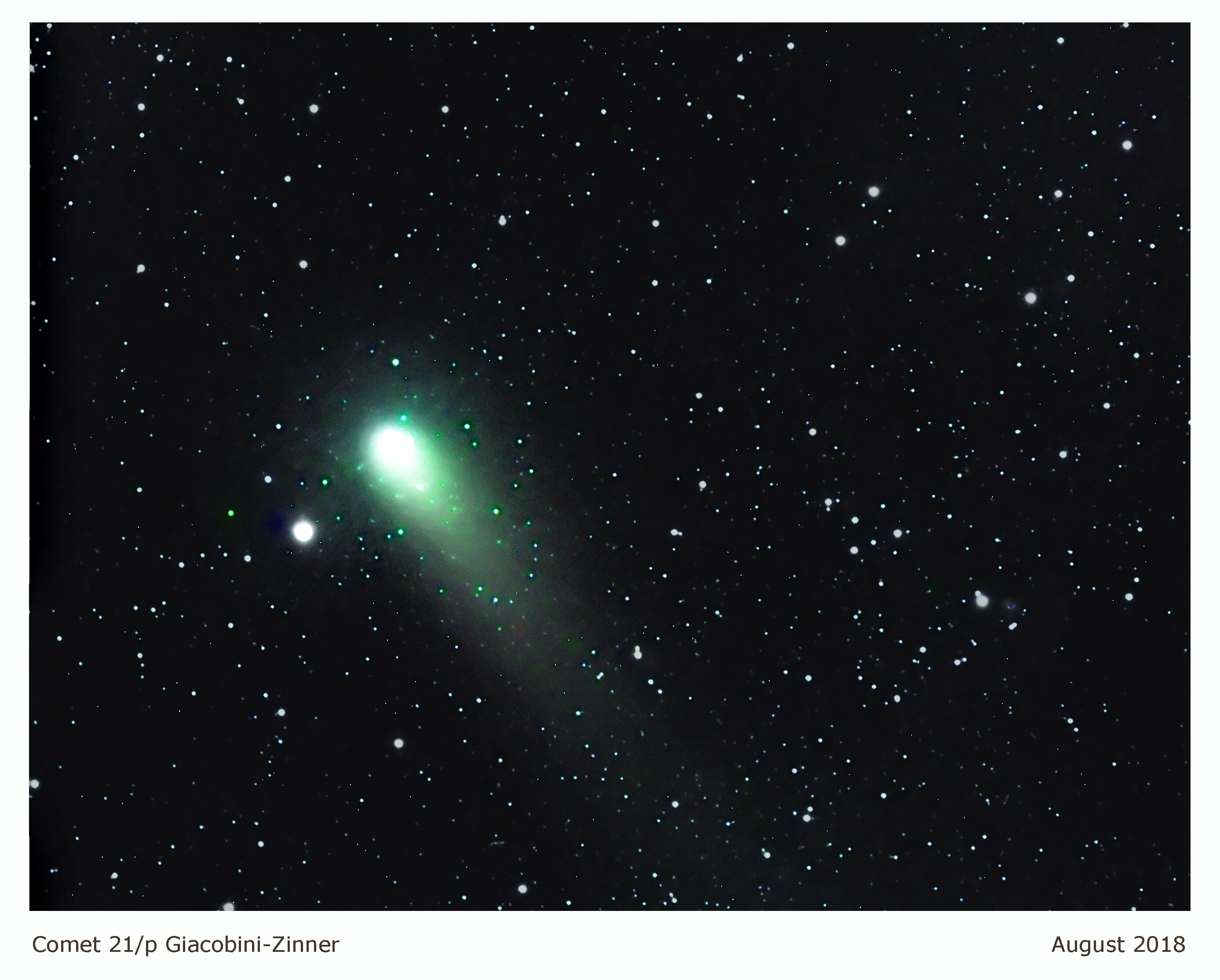 Μια προσπάθεια φωτογράφησης του κομήτη 21p το βράδυ της 19/8/2018 καθώς αυτες τις ημέρες διέρχεται στον αστερισμό της καμηλοπαρδαλης στο βοριοανατολικο ουρανο. ο κομήτης 21P/Giacobini-Zinner (Τζιακομπίνι-Ζίννερ), ανακαλύφθηκε το 1900. Ανήκει στην οικογένεια κομητών του Δία, οπότε και επανέρχεται συχνά (κάθε 6.6 χρόνια περίπου). Η διάμετρος του κομήτη ειναι περιπου 2,3 χιλιόμετρα.