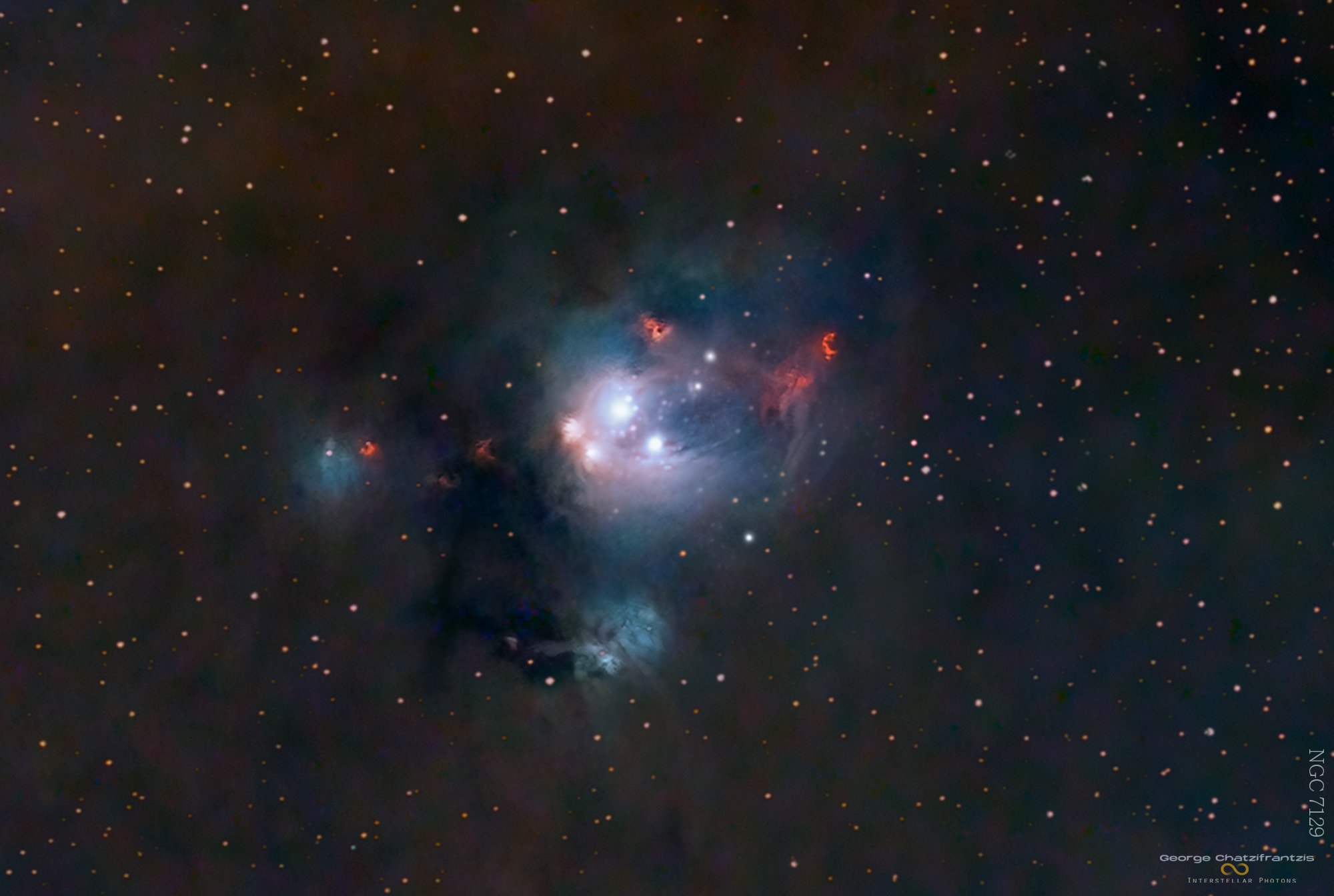 Το NGC 7129 είναι ένα νεφέλωμα αντανάκλασης που βρίσκεται 3.300 έτη φωτός μακριά στον αστερισμό Cepheus. Ένα νεαρό ανοικτό σύμπλεγμα είναι υπεύθυνο για το φωτισμό του γύρω νεφελώματος. Μια πρόσφατη έρευνα δείχνει ότι το σύμπλεγμα περιέχει περισσότερα από 130 αστέρια ηλικίας μικρότερης του ενός εκατομμυρίου ετών.