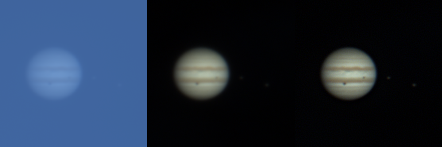Λήψη στις 12/3/2026 17:09 (UTC+2). Με dobsonian SkyWatcher 200, κάμερα ZWO ASI585MC Pro, Baader UV-IR cut, πολωτή. Stacking 278 εικόνων, 25 ms η κάθε μία, επεξεργασία με AstroSurface V4. Αριστερά μόνο stacking, στο κέντρο έχει αφαιρεθεί το φως της ημέρας, δεξιά wavelets. Η Ιώ είναι ο δορυφόρος με τη μικρότερη σκιά, πάνω. Η σκιά του Γανυμήδη διακρινόταν και με το μάτι στο τηλεσκόπιο. Ο πολωτής προσέφερε σημαντική αύξηση της ευκρίνειας, κόβοντας αρκετό από το σκεδαζόμενο φως.