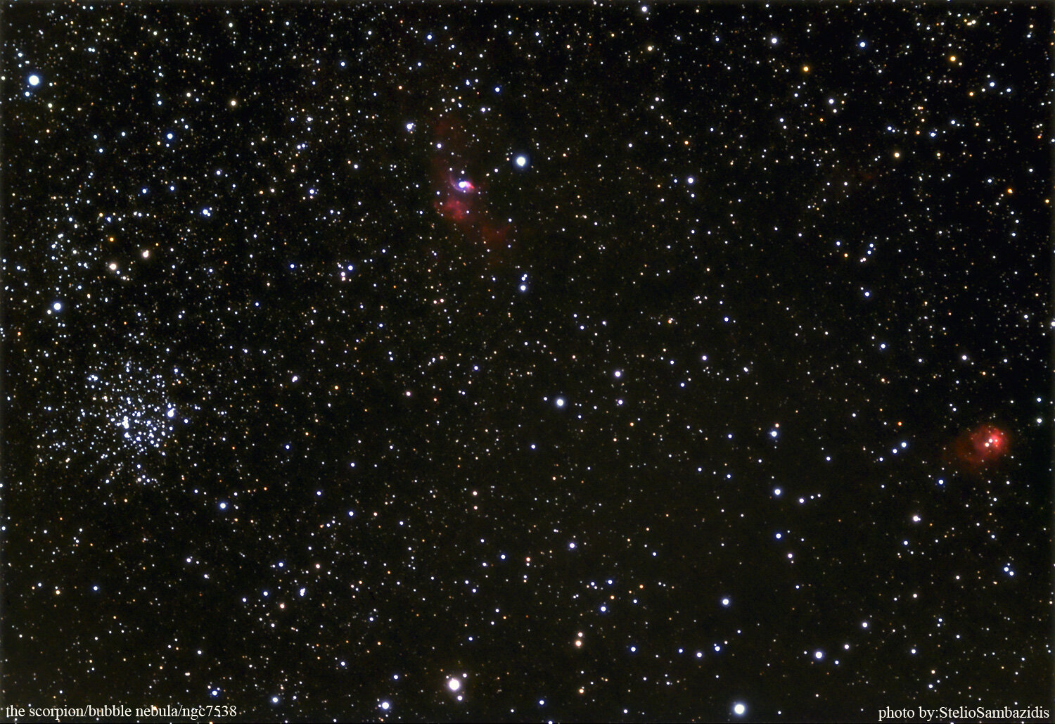 Αγαπητοι Αγγελος και Ηλιας σας ξανανεβαζω την φωτο αλλα αυτη την φορα με μια επεξεργασια που βγαζει πολυ περισσοτερο υδρογονο στην "επιφανεια".Η διαφορα στα δυο dso ειναι εμφανεστατη.Οπως θα διαπιστωσετε ομως αυτο εχει σαν αποτελεσμα απο το κεντρο περιπου και προς τα κατω να "καφετιζει" καπως το background.Αυτο ειναι επισης υδρογονο που υπαρχει στην περιοχη και "πασχιζει" αλλα η ληψη δεν καταφερε να το καταγραψει και να το εμφανισει.Ετσι δινει αυτην την καφετι αποχρωση.Με ακομη ποιο ακραιες και σκληρες ρυθμισεις φαινεται ακομη περισσοτερο.