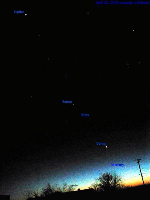 Image taken on April 23, 2002 form my home in Lancaster, California. Using a 1.2 megapixel Olympus camera. According to Starry Night Pro, the asteroid Vesta was between Jupiter and saturn on that day.