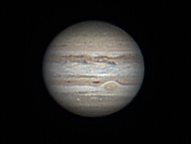 dimikolgr 12 Δημοσιεύτηκε Σεπτέμβριος 8, 2009 Γειά σας παιδιά. Την καλύτερή μου εμπειρία με τον Δία την είχα δύο περίπου ημέρες πρίν κάνω αυτή την εικόνα.Αν και ο Δίας ήταν αρκετά χαμηλά, εκείνο το βραδάκι το seeing ήταν πράγματι καλό.Ιδιαίτερα μόλις μπήκε πίσω απο μία πολύ ελαφρά νέφωση το είδωλό του σταθεροποιήθηκε πολύ.Ίσα που αναδεύονταν κάπου κάπου.Τι ζώνες,τι festoons, η ερυθρά κηλίδα! Ο μεγάλος μου γιός δεν χόρταινε να τον βλέπει.Ήταν η καλύτερή μου εικόνα που είχα για το 2009 και βάλε.