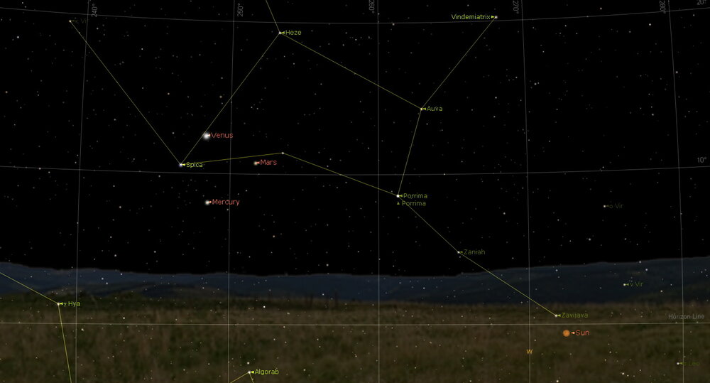 2. Λέγοντας τριπλή εννοώ τριών πλανητών (Ερμή, Αφροδίτης, Άρη). Οι πλανητικές σύνοδοι έχουν ως εξής: 23 Αυγούστου Ερμής 1°15΄Νότια της Αφροδίτης. 11 Σεπτεμβρίου Ερμής 3°34΄Νότια της Αφροδίτης. 11 Σεπτεμβρίου Αφροδίτη 20' Βόρεια του Άρη. 12 Σεπτεμβρίου Ερμής 3°26΄Νότια του Άρη. 19 Σεπτεμβρίου Ερμής 4°08' Νότια του Άρη. Από 3 Σεπτεμβρίου έως 19 Σεπτεμβρίου Ερμής, Αφροδίτη και Άρης θα βρίσκονται σε γωνιώδη απόσταση μικρότερη των 5°! Στις 18 και 19 Σεπτεμβρίου Ερμής, Αφροδίτη, Άρης και Στάχυς θα απέχουν λιγότερο από 5° (η φωτό αφορά την 18 Σεπτεμβρίου και είναι από το Starry night). Στη φωτό φαίνονται οι πλανήτες και το ύψος τους τη στιγμή της δύσης. Δυστυχώς, όπως βλέπουμε ο Ερμής έχει ύψος μόλις 8° και ο Στάχυς και ο Άρης ~10.5°, που σημαίνει ότι η μόνη δυνατότητα εντοπισμού τους είναι με κυάλια. Θα άξιζε τον κόπο πάντως να δοκιμάσει κανείς να εντοπίσει τον Άρη με γυμνό μάτι το απόγευμα της 11ης Σεπτεμβρίου που θα απέχει από την Αφροδίτη κάτι λιγότερο από μία σεληνιακή διάμετρο, όμως με τη χαμηλή λαμπρότητα που έχει (δευτέρου μεγέθους) το θεωρώ απίθανο.