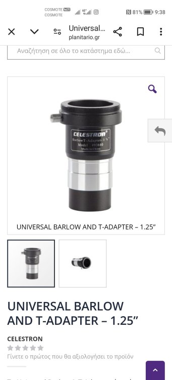 Γειά και χαρά σε όλους, είμαι εδώ κι ένα χρόνο στο χόμπι της αστροφωτογραφίας.. Ένα δύσκολο χόμπι οφείλω να ομολογήσω, λόγο πολλών παραγόντων. Όμως θα ήθελα να αρχίσω να φωτογραφίζω κ την Σελήνη. Έχω κάνει κάπιες απόπειρες για τους κρατήρες κτλ όμως το 80% είχαν αποτυχία λόγο κακό seeing και λογο κακού η λάθος εξοπλισμου που διαθέτω. Όταν εννοώ σελήνη εννοώ κοντινά πλάνα σε κρατηρες όρη κτλ, κι όχι όλο το φεγγάρι. Επίσης δεν θέλω και δεν έχω να διαθέσω πολλά χρήματα για αλλαγή εξοπλισμου πλανητικης κάμερας κ τηλεσκόπιου. Ο εξοπλισμός που έχω για σελήνιακη απεικόνιση είναι ένα Mak 90 μια Dslr ένα Barlow μέτριας ποιότητας, και αντάπτορες ώστε να φωτογραφίζω με την μεγενθυση του προσοφθαλμιου πχ το 10mm. Όμως διαπίστωσα ότι με αυτό το προσοφθαλμιο η ποιότητα των εικόνων είναι πολύ χαμηλή έως μέτρια, όμως προσφέρει κάτι παραπάνω από τον barlow σε ζουμ κτλ. Από την άλλη ο barlow έχει αρκετά καλή ποιότητα σε σχέση με το προσοφθαλμιο αλλά δεν έχει τόσο ζουμ. Οσω κροπ στην εικόνα κ να κάνω έχει γενικό πλάνο κτλ. Ο τρόπος που φωτογραφίζω ειν αυτός της βιντεοαστρομιας, βγάζω ένα βίντεακι του ενός λεπτού η δύο, κ το περνάω από διάφορα προγράμματα ώστε να μου δώσει το τελικό αποτέλεσμα. Η ερώτησή μου είναι η εξής: υπάρχει στην αγορά κάπιο καλό προσοφθαλμιο ώστε να δώσει καλύτερη ποιότητα στην τελική εικόνα μου η κάποιος καλός ποιοτικός barlow x2η x3? Επειδή εγώ δεν ξέρω τι είναι καλό από πλευράς ποιότητας εικόνας που αποδίδει, θα ήθελα να μου πείτε τι πρέπει να αγοράσω είτε από barlow είτε από προσοφθαλμιο. Ευχαριστώ.