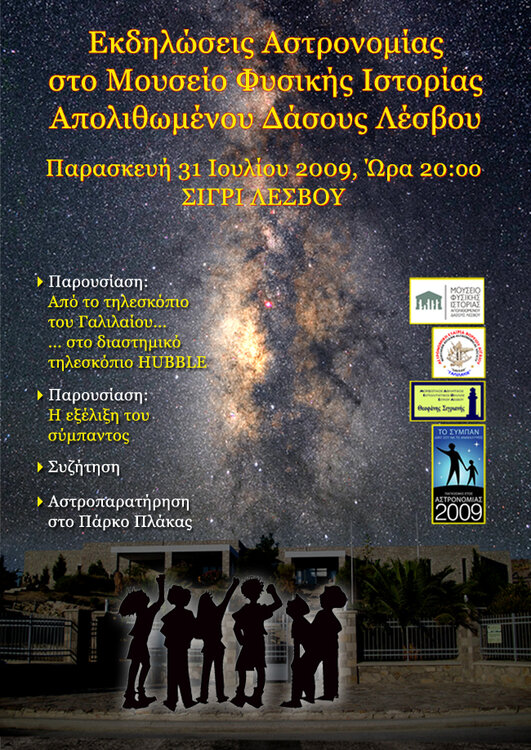 Σειρά εκδηλώσεων με αφορμή τον γιορτασμό του Παγκόσμιου Έτους Αστρονομίας πραγματοποιούνται από την αρχή της χρονιάς στο Απολιθωμένο Δάσος Λέσβου. Οι εκδηλώσεις συνδιοργανώνονται από το Μουσείου Φυσικής Ιστορίας Απολιθωμένου Δάσους Λέσβου, την Αστρονομική Εταιρεία Βορείου Αιγαίου «Γαλιλαίος» και το Σωματείο «Οι Φίλοι του Απολιθωμένου Δάσους Λέσβου». Στόχος και αυτών των εκδηλώσεων είναι να φέρουν τον απλό κόσμο και κυρίως τους νέους πιο κοντά στην αστρονομία, συμβάλλοντας έτσι στην συνολική παγκόσμια προσπάθεια για βελτίωση της πληροφόρησης ότι ο σκοτεινός ουρανός είναι ένας μεγαλοπρεπής, αλλά συχνά αγνοημένος πολιτιστικός πόρος για όλη την ανθρωπότητα. Αφορμή για την διοργάνωση των εκδηλώσεων ήταν η απόφαση της Διεθνούς Αστρονομικής Ένωσης (ΙUA) και της UNESCO, που όρισε το 2009 σαν Παγκόσμιο Έτος Αστρονομίας, με αφορμή τα 400 χρόνια της παρατήρησης του ουρανού με τηλεσκόπιο από τον Γαλιλαίο. Το Διεθνές Έτος Αστρονομίας 2009 είναι ένας παγκόσμιος εορτασμός της αστρονομίας και των συνεισφορών της στην κοινωνία και τον πολιτισμό, που υποκινεί το παγκόσμιο ενδιαφέρον όχι μόνο για την αστρονομία αλλά και για την επιστήμη γενικά, με ιδιαίτερη έμφαση προς τους νέους. Διάφορες εκδηλώσεις θα πραγματοποιηθούν σε όλο τον κόσμο υπό τον τίτλο «Το Σύμπαν, Δικό σου να το Ανακαλύψεις». Στο εορτασμό αποφάσισαν να συμμετάσχουν και τα Ευρωπαϊκά Γεωπάρκα καθώς τα Γεωπάρκα είναι τόποι ιδανικοί για παρατήρηση του νυχτερινού ουρανού, λόγω έλλειψης τεχνητού φωτισμού και μειωμένης φωτορύπανσης. Η επόμενη εκδήλωση θα πραγματοποιηθεί την Παρασκευή 31 Ιουλίου 2009 και ώρα 8 το βράδυ. Το πρώτο μέρος της εκδήλωσης θα πραγματοποιηθεί στην αίθουσα εκδηλώσεων του Μουσείου στο Σίγρι και περιλαμβάνει παρουσιάσεις από τα μέλη της Αστρονομικής Εταιρίας Βορείου Αιγαίου «Γαλιλαίος». Ο Αντώνης Γεωργίου θα παρουσιάσει το θέμα: «Από το τηλεσκόπιο του Γαλιλαίου … στο διαστημικό τηλεσκόπιο HUBBLE» και στη συνέχεια, ο Βαγγέλης Καπιωτάς θα παρουσιάσει το θέμα «Η εξέλιξη του σύμπαντος». Στη συνέχεια η εκδήλωση μεταφέρεται στο Πάρκο Πλάκας, όπου θα ακολουθήσει παρατήρηση του έναστρου ουρανού μακριά από τα ελάχιστα φώτα της κατοικημένης περιοχής και θα πραγματοποιηθεί ξενάγηση-περιήγηση στον νυχτερινό ουρανό από τα μέλη της Αστρονομικής Εταιρίας Βορ. Αιγαίου ¨Γαλιλαίος». Η είσοδος σε όλες τις εκδηλώσεις είναι ελεύθερη. -