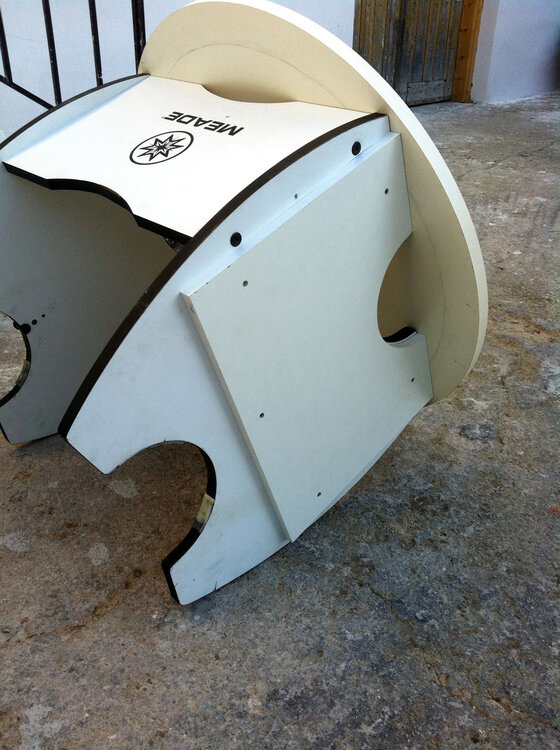 Kαλησπέρα σε όλους. Αυτή τη φορά θα σας παρουσιάσω τι μετατροπή έκανα στη βάση ώστε να την επιδιορθώσω απο τη φυσική φθορά. Είναι χρήσιμο να γνωρίζετε (πολλοί ίσως να μην το γνωρίζουν) οτι η βάση του Lightbridge είναι κατασκευασμένη απο νοβοπάν. Τι είναι το νοβοπάν? Ρινίσματα ξύλου (ορίστε και ένας λόγος που κρατιέται χαμηλά η τιμή ενός 16αριού). Τα ρινίσματα του ξύλου είναι ανεμιγμένα με κόλλα και αυτό έχει ως αποτέλεσμα, τα ξύλινα μέρη του να έχουν μια πυκνότητα και μια σκληρότητα. Τι συμβαίνει όμως όταν πάνω σε αυτά κάθεται ένα τηλεσκόπιο που ζυγίζει 50 κιλά? Στην αρχή όλα πάνε καλά. Όσο περνά ο καιρός όμως το νοβοπάν παρουσιάζει αστοχίες. Σε μένα προσωπικά, ύστερα απο κάμποσες παρατηρήσεις στα βουνά με υγρασία και ύστερα απο 4 χρόνια συνεχούς χρήσης, η μια βίδα που συγκρατεί το νοβοπάν της βάσης με το νοβοπάν πάνω στο οποίο κάθεται το τηλεσκόπιο, έσκασε μέσα και δημιούργησε τρύπα με αποτέλεσμα να χάσει εντελώς τη σταθερότητά του. Επίσης, πρέπει να γνωρίζετε οτι το νοβοπάν είναι υπερβολικά ευαίσθητο στην υγρασία και απορροφάει πάρα πολύ εύκολα (ιδού και ο λόγος που το έχουν καλύψει με ένα κολλητικό χαρτί στις επιφάνειές του και με λάστιχο στη περίμετρο). Η υγρασία έχει ως αποτέλεσμα τη σημαντικότερη φθορά που μπορεί να πάθει η συγκεκριμένη βάση. Το να φουσκώνει το ξύλο. Μπορεί να μην σας ακούγεται κάτι τόσο τρομερό. Όμως είναι! Το τηλεσκόπιο πλέον καθίσταται ανίκανο να παρατηρεί γιατί είναι υπερβολικά δύσκολο να τσουλάει στο αζιμούθιο με ακρίβεια (κάτι που ζητάμε σαν τρελοί όταν παρατηρούμε). Γι αυτούς τους λόγους επέλεξα να πετάξω το φύλο του αλουμινίου που σας είχα πει παλιότερα οτι είχα τοποθετήσει και να επισκευάσω-ενισχύσω την ήδη υπάρχουσα βάση. Το φύλο του αλουμινίου παρεπιπτόντως δεν έκανε πολλά. Πάλι είχε σκληρή κίνηση και δεν συνεργαζόταν τέλεια με τα τεφλόν της βάσης χώρια το γεγονός οτι τα κατεστραμένα και φουσκωμένα απο την υγρασία, νοβοπάν δεν μπορούσαν να αποδώσουν έτσι όπως έπρεπε. Αυτό λοιπόν που επέλεξα να κάνω ήταν να πάω σε ένα πολύ καλό ξυλουργείο και να "αντιγράψω" το νοβοπάν της βάσης. Δηλαδή αυτό που εδράζει πάνω στο νοβοπάν που ακουμπά στο έδαφος. Το αντικαταστήσαμε με κόντρα πλακέ θαλάσσης πάχους 2 cm έναντι 1.5 cm που ήταν το νοβοπάν που προσέφερε η Meade. Το κόλπο όμως ήταν αλλού. Το κόντρα πλακέ θαλάσσης το επικαλύψαμε με φορμάικα άσπρη η οποία συνεργάζεται αρκετά καλά με τα τεφλόν. Ακριβώς απο πάνω στερεώσαμε τη βάση στην οποία κάθεται το τηλεσκόπιο η οποία όμως ήταν πληγωμένη αρκετά (είχαν σκάσει οι βίδες μέσα στο νοβοπάν και έπαιζε). Έτσι λοιπόν επιλέξαμε να την ενισχύσουμε με κόντρα πλακέ θαλάσσης απο την εξωτερική πλευρά τα οποία στερεώσαμε σε όλες τις πλευρές της βάσης. Το αποτέλεσμα ήταν να δημιουργηθεί μια απίστευτα στιβαρή βάση! Σε μεγάλες μεγεθύνσεις το τηλεσκόπιο τσουλάει τέλεια στο αζιμούθιο και στέκεται ακριβώς εκεί που θα το αφήσεις. Όσοι δεν έχετε καταλάβει πλήρως το σχέδιο, σας παρουσιάζω 3 φωτογραφίες οι οποίες θα σας δώσουν να καταλάβετε ακριβώς τι φτιάξαμε. Να σας πω επίσης οτι το συνολικό κόστος κατασκευής ήταν ακριβώς 70 ευρώ!!!