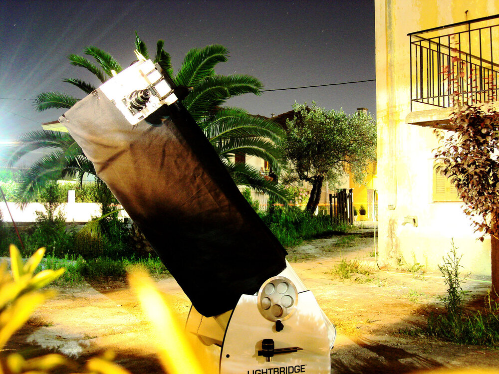 Καλημέρα σε όλους παιδιά! Ύστερα απο μερικά χρόνια απο το πρώτο review, ήρθε η ώρα να συμπληρώσω απο την εμπειρία μου πάνω σε αυτό το τηλεσκόπιο. Πολλοί απο εσάς ήσασταν στο Πανελλήνιο συνέδριο στον Πάρνωνα φέτος και σίγουρα θα είδατε μέσα απο το LIGHTBRIDGE του άρθρου αυτού. Πολλά παιδιά ήρθαν γύρω απο το τηλεσκόπιο να παρατηρήσουμε μαζί και πραγματικά πέρασα υπέροχα. Το highlight της βραδιάς ήταν η προσπάθεια να εντοπίσουμε τον NGC 6906 ανάμεσα στο Δελφίνι και την Aquila. Μάταια όμως γιατί δεν είχα άλλη υπομονή και καλό αστρονομονοπάτι. Είδαμε όμως άλλα υπέροχα όπως: Stephans Quintet: φαινόταν μόνο η τριπλέτα εκ των 5 Μ51: φαινόταν και η γέφυρα ΝGC 7331: Ολόκληρος με τους δορυφόρους του Lagoon, Trifid, Swan nebula σε όλο τους το μεγαλείο με εξαιρετική λεπτομέρεια και λίγο χρώμα ΝGC 457 (ET): πολύ γέλιο! M96 , M95: Ικανοποιητικά Ε Λύρας σχετικά διαχωρισμένοι ΝGC 6960: σου έκοβε την ανάσα με εξαιρετική λεπτομέρεια-δομή! Αυτά είναι τα όσα θυμάμαι. Να σημειώσω επίσης οτι ύστερα απο μέτρηση, το κάτοπτρο φάνηκε να είναι λ/5,5! Επίσης να προσθέσω το εξής. Όλοι με ρωτούσαν πόσο κοστίζει το τηλεσκόπιο σκέτο. Απαντώ και πάλι πολύ συγκεκριμένα και είμαι σχεδόν κάθετος σε αυτό. Δεν αρκεί το μεγάλο διαμέτρημα. Μαζί με το μεγάλο διαμέτρημα ακολουθεί και μια ομάδα απο εξαιρετικά προσοφθάλμια. Προτείνω με κλειστά μάτια τα Τelevue Nagler, Ethos & Panoptic. Το τηλεσκόπιο δεν αξίζει να αγορασθεί αν είναι να το λειτουργήσει κανείς με Plossl και με προσοφθάλμια της μάνας του. Είναι σαν να αγοράζουμε ένα πολύ καλό αυτοκίνητο και να ζούμε σε νησί με χωματόδρομους. Τα μεγάλα τηλεσκόπια απαιτούν και "μεγάλα" αξεσουάρ. Παραθέτω και μερικές φωτογραφίες.