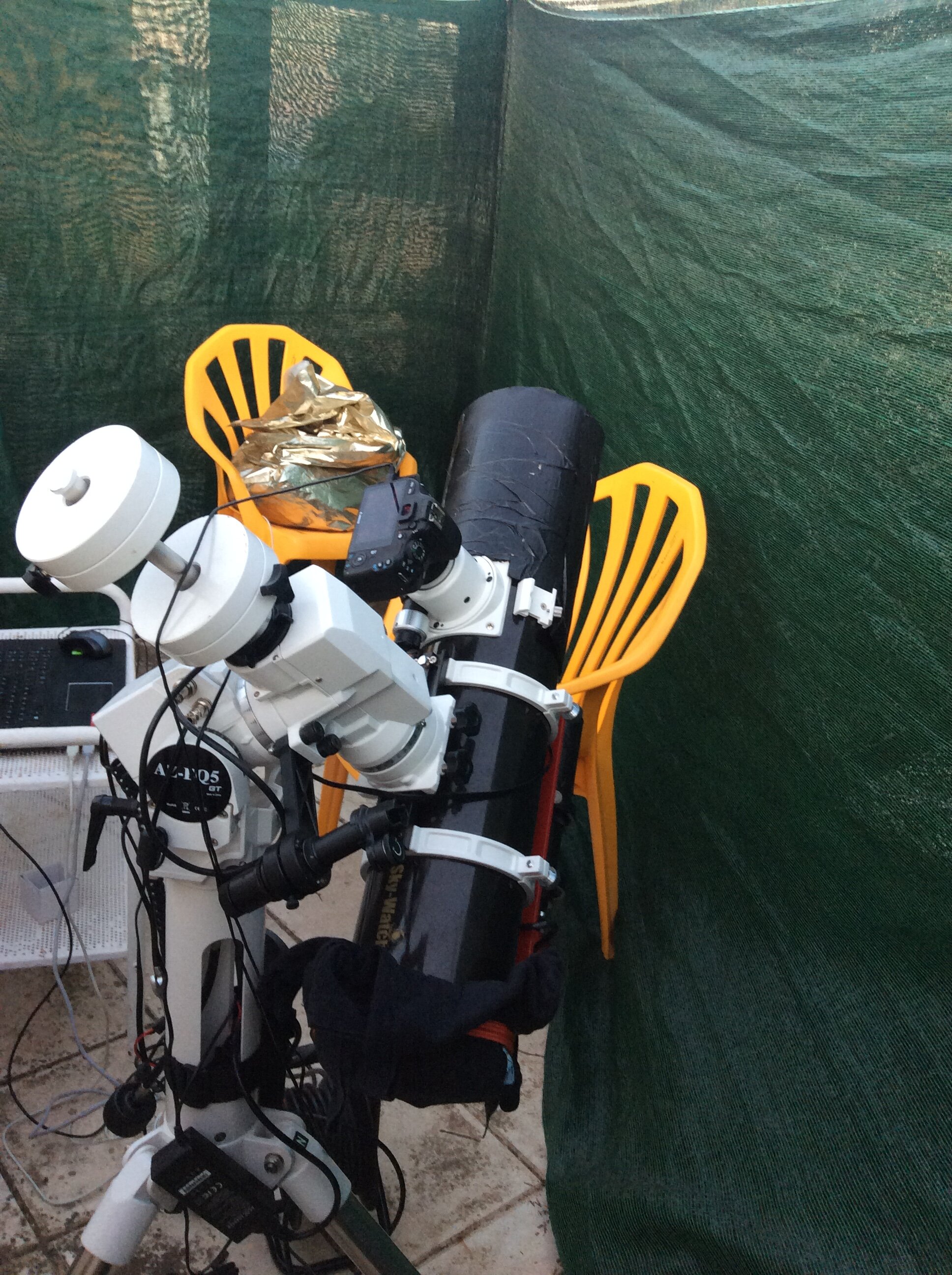 Εχοντας την τυχη να μενω λιγο εξω απο την Αθηνα, με σχετικα καλη ποιοτητα ουρανου, παντα ηθελα να εχω εναν μικρο χωρο για το τηλεσκοπιο μου αλλα δυστυχως τα οικονομικα μου δεν βοηθανε. Μετα απο επισκεψεις και συζητησεις με τον scaff και τον stamosp, μου μπηκε η ιδεα να προσπαθησω με κοντραπλακε να περιορισω τα φωτα του δρομου και γειτονων που χτυπανε τον εξοπλισμο μου στη ταρατσα. Η συζητηση ξεκινησε επειδη στο phd επρεπε να παει ο στοχος πανω απο 50 μοιρες για να οδηγω στο 1,5. Δυστυχως και το κοντρα πλακε ακριβο μου εβγαινε, οποτε παλι μετα απο προτροπη καποιου απο τα δυο παιδια, στραφηκα σε λινατσες, απο αυτες που χρησιμοποιουν οσοι καλλιεργουν (ειμαι ερασιτεχνης λαχανοκαλλιεργητης και εγω οποτε ειχα μια ιδεα) για να κοβουν αερα. Πηγα σε μια οικοδομη και μαζεψα καδρονακια, τα ετριψα με γυαλοχαρτο και στη συνεχεια με γωνιες τα βιδωσα στο τοιχιο μου. Στη συνεχεια εβαλα πανω κρικους και σε αυτους περασα τις λινατσες, διπλη στρωση. Στο συνολο δεν εδωσα ουτε 50 ευρω. Το αποτελεσμα ηταν πως χθες στις Πλειαδες απο τις 25 μοιρες οδηγουσα στο 1,5 και στις 35 στα 2. Στο δε wizard που ηταν ψηλα πηγαινε και παραπανω. Επισης ειδα μεγαλη διαφορα στο θορυβο στα καρε μου. Μαλιστα αρχικα που σε μια γωνιτσα δεν ειχα κλεισει, η διαφορα στο ABE ηταν εμφανεστατη. Οποτε και εκει μου εκανε δουλιτσα. Αρκει απλα να ξεπιασεις τις λινατσες απο τους κρικους και σε δυο λεπτα τα εχεις μαζεψει ολα, αν χρειαζεται για καποιο λογο. Σιγουρα δεν ειναι ομορφο οσο μια ολοκληρωμενη κατασκευη και ακομα πιο σιγουρα υστερει σε σχεση με κατι τετοιο στο αποτελεσμα, ομως για καποιον που δεν μπορει να διαθεσει μεγαλο ποσο, ειναι μια ευκολη και γρηγορη λυση που βοηθαει αρκετα στον περιορισμο απο κοντινα φωτα.
