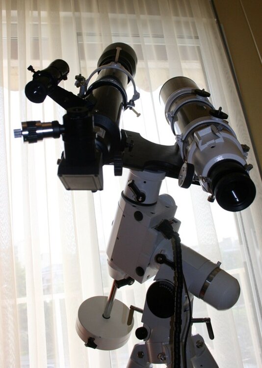 23. Όχι δεν είναι καινούργιος! Εντάξει εκτός απο το Bresser. Δεν τον είχα παρουσίασει ποτέ όμως και είπα να το κάνω σήμερα. Αυτός λοιπόν είναι ο αστροφωτογραφικός μου εξοπλισμός, μέχρι τώρα είχα στη θέση του bresser ένα sk-70/500 το οποίο δούλευει πολύ καλά αλλά ήθελα μεγαλύτερη εστιακή απόσταση του οδηγήτικού (οδήγηση κάνω με το μάτι όπως μπορείτε να δείτε) και έτσι χτύπησα το bresseraki. Καλό το bresser για οδηγητικό, λίγο τον εστιαστή περίμενα καλύτερo αλλά εντάξει πιστεύω ότι θα κάνει δουλειά. Το σύστημα στήριξης του πάνω στην πλατφόρμα, και η ίδια η πλατφόρμα είναι ιδιοκατασκευή του φίλου Αριστείδη Βούλγαρη, τον οποίο και ευχαριστώ ιδιαιτέρως. Φωτογραφικό τηλεσκόπιο έχω το sk80ED που με συντροφεύει παντού, ακόμα και στα 2900 του Ολύμπου!! Στήριξη η καλύτερη για μένα Heq5 skyscan, ως προς λόγο προσέξτε, τιμής-απόδοσης-όγκου. Για τα κιλά που χρησιμοποιώ είναι κάτι παραπάνω απο τέλεια!! Αυτά σε γενικές γραμμές, δεν θα μπω σε περισσότερες λεπτομέρειες. ευελπιστούμε σε καθαρούς ουρανούς τώρα.. Φως απο την new version του εξοπλισμού λοιπόν θα δούμε στην επόμενη εξόρμηση.