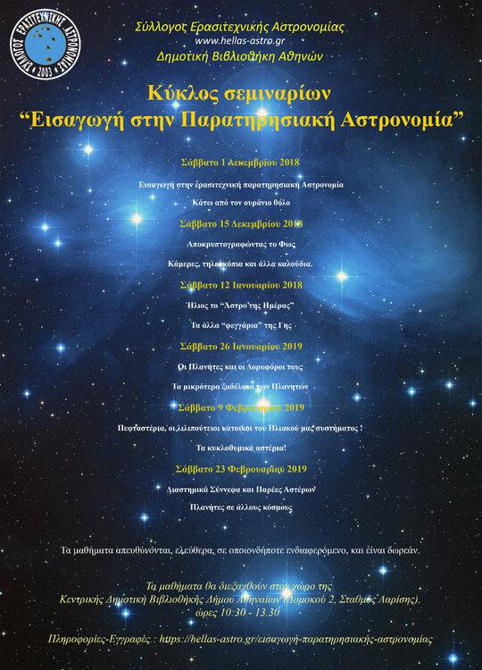 Καλησπέρα σε όλους. Ο Σύλλογος Ερασιτεχνικής Αστρονομίας, μέσα από την πολυετή του εμπειρία σε διεξαγωγή σεμιναρίων και παρουσιάσεων, ανακοινώνει ένα νέο κύκλο μαθημάτων με θέμα την "Εισαγωγή στην Παρατηρησιακή Αστρονομία". Οι συναντήσεις ξεκινάνε αυτό το Σάββατο 1η Δεκ. και θα συνεχιστούν ανά δύο βδομάδες μέχρι τον Φλεβάρη 2019, στην Δημοτική Βιβλιοθήκη Αθηνών. Βρείτε συνημμένη την αφίσα του προγράμματος καθώς και περισσότερες λεπτομέρειες της δράσης στην σελίδα μας. -