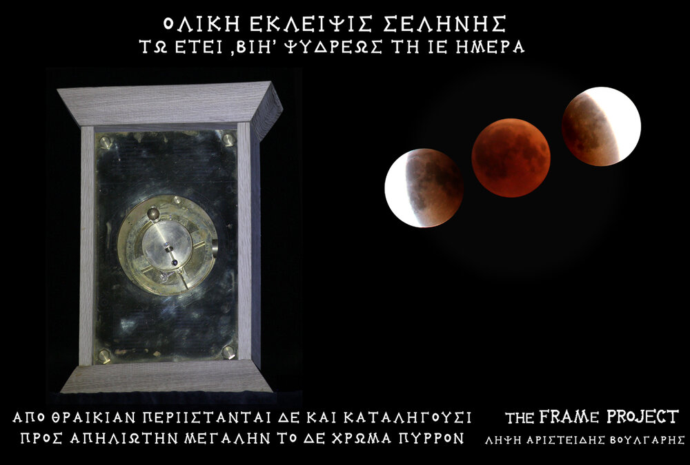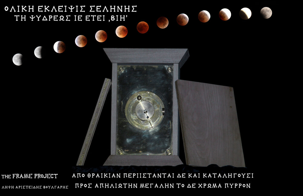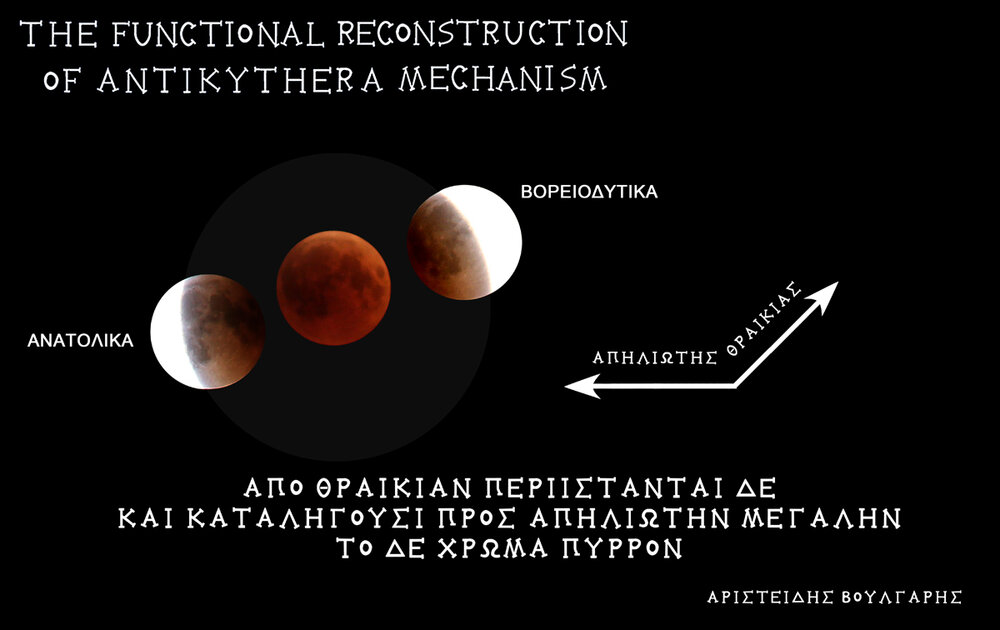 Φωτογραφίζοντας το Μηχανισμό των Αντικυθήρων κατά τη διάρκεια της Ολικής Έκλειψης Σελήνης της 27ης Ιουλίου 2018 Πριν, μετά και κατά τη διάρκεια της ολικής έκλειψης Σελήνης που έλαβε χώρα την 27η Ιουλίου 2018, φωτογραφήθηκε ένα λειτουργικό αντίγραφο του Μηχανισμού των Αντικυθήρων κατασκευασμένο από την ομάδα The Functional Reconstruction of Antikythera Mechanism (The FRAMe Project), με φόντο το φαινόμενο της έκλειψης (copyright Α. Βούλγαρης - The FRAMe Project). Στον υπότιτλο της φωτογραφίας παρουσιάζεται η επιγραφή που διασώζεται και είναι αντιληπτή δια γυμνού οφθαλμού, σε σημείο στην πίσω πλευρά του βασικού τμήματος του αρχαίου πρωτοτύπου, του Θραύσματος Α (καθώς και με τη βοήθεια των τομογραφιών ακτίνων -Χ, οι οποίες ελήφθησαν κατά το πρόγραμμα AMRP (http://www.antikythera-mechanism.gr/). Στο σημείο αυτό (πίσω μπρούντζινη πλάκα του αρχαίου πρωτοτύπου) η χαραγμένη μία επιγραφή αναφέρεται σε μία (ολική) έκλειψη Σελήνης και δίνει πληροφορίες κατεύθυνσης και περιγραφής της έκλειψης: ‘’…ΑΠΟ ΘΡΑΙΚΙΑΝ ΠΕΡΙΙΣΤΑΝΤΑΙ ΔΕ ΚΑΙ ΚΑΤΑΛΗΓΟΥΣΙ ΠΡΟΣ ΑΠΗΛΙΩΤΗΝ ΜΕΓΑΛΗΝ ΤΟ ΔΕ ΧΡΩΜΑ ΠΥΡΡΟΝ’’ “…ΕΡΧΕΤΑΙ ΑΠΟ ΤΟΝ ΘΡΑΙΚΙΑΝ (βορειοδυτικός άνεμος) ΣΤΡΙΒΕΙ ΚΑΙ ΚΑΤΑΛΗΓΕΙ ΠΡΟΣ ΑΠΗΛΙΩΤΗ (ανατολικός άνεμος), ΤΟ ΧΡΩΜΑ ΕΙΝΑΙ ΠΥΡΡΟΝ” (Anastasiou, M., Bitsakis Y., Jones A., Steele J. M., and Zafeiropoulou M., 2016: “The Back Dial and Back Plate Inscriptions.” In Special Issue: The Inscriptions of the Antikythera Mechanism, Almagest 7.1: 138– 215). Η επιγραφή αναφέρεται στη διεύθυνση της σκιάς της Γής που προβάλλεται στο σεληνιακό δίσκο. Στην έκλειψη της 27ης Ιουλίου, η σταδιακή κάλυψη και αποκάλυψη του Σεληνιακού δίσκου έγινε επίσης με την προαναφερόμενη κατεύθυνση. Ο Μηχανισμός των Αντικυθήρων, ήταν ένας μηχανικός γραναζωτός μηχανισμός, κατασκευασμένος περίπου το 120 π.Χ., πιθανώς από κάποιον μηχανικό, αστρονόμο, γεωμέτρη και πολύ ιδιαίτερο κατασκευαστή. Αποτελούνταν από τουλάχιστον 35 γρανάζια, με άξονες, δείκτες και βαθμονομημένες κλίμακες. Υπολόγιζε τη θέση του Ηλίου στον ουρανό, τις φάσεις της Σελήνης και τις ημερομηνίες των εκλείψεων αυτών των δύο ουρανίων σωμάτων. Από τα αρχαία χρόνια, μέχρι και σήμερα οι ολικές εκλείψεις Ηλίου και Σελήνης παρουσιάζουν μεγάλο ενδιαφέρον. Η καταστροφή του στρατού των Αθηναίων ενώ πολιορκούσαν τις Συρακούσες στη Σικελία συνδέθηκε με την ολική έκλειψη σελήνης της 27ης Αυγούστου του 413 π.Χ (Πλούταρχος, Νικίας, 22.1-23.9http:// http://www.greek-language.gr/digitalResources/ancient_greek/library/browse.html?text_id=102&page=17). Οι κατασκευές των αντιγράφων του Μηχανισμού των Αντικυθήρων πραγματοποιήθηκαν κατά την υλοποίηση του προγράμματος ‘’The Functional Reconstruction of Antikythera Mechanism, The FRAMe project’’. Στο πρόγραμμα συμμετέχουν οι Αριστείδης Βούλγαρης κατασκευαστής αστρονομικών οργάνων, Dr. Χριστόφορος Μουρατίδης μαθηματικός και Ανδρέας Βοσινάκης γραφίστας βιομηχανικού σχεδίου. Για την κατασκευή των μοντέλων μελετήθηκε η σχετική βιβλιογραφία και οι τομογραφίες ακτίνων -Χ που ελήφθησαν από το πρόγραμμα Antikythera Mechanism Research Project. The FRAMe Project Αριστείδης Βούλγαρης -